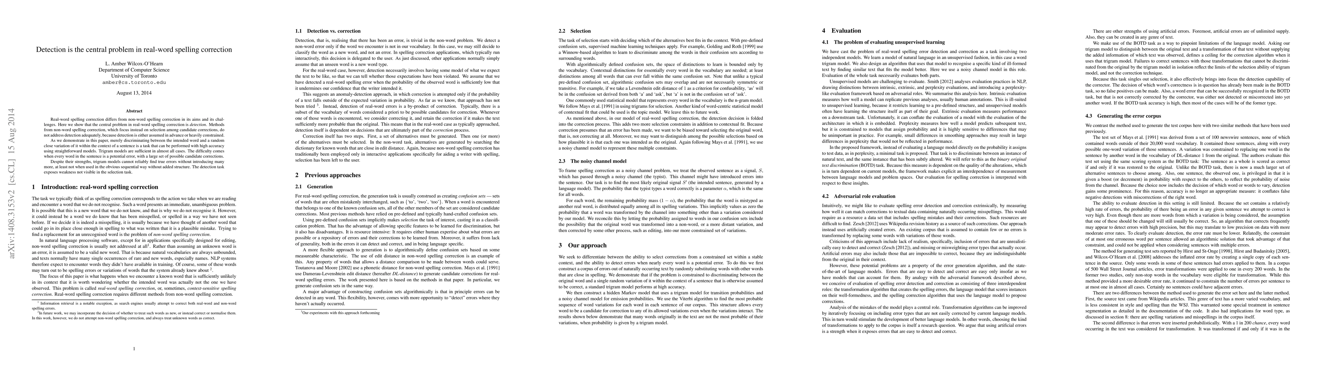 Real-word spelling correction differs from non-word spelling correction in its aims and its challenges. Here we show that the central problem in real-word spelling correction is detection. Methods from non-word spelling correction, which focus instead on selection among candidate corrections, do not address detection adequately, because detection is either assumed in advance or heavily constrained. As we demonstrate in this paper, merely discriminating between the intended word and a random close variation of it within the context of a sentence is a task that can be performed with high accuracy using straightforward models. Trigram models are sufficient in almost all cases. The difficulty comes when every word in the sentence is a potential error, with a large set of possible candidate corrections. Despite their strengths, trigram models cannot reliably find true errors without introducing many more, at least not when used in the obvious sequential way without added structure. The detection task exposes weakness not visible in the selection task.