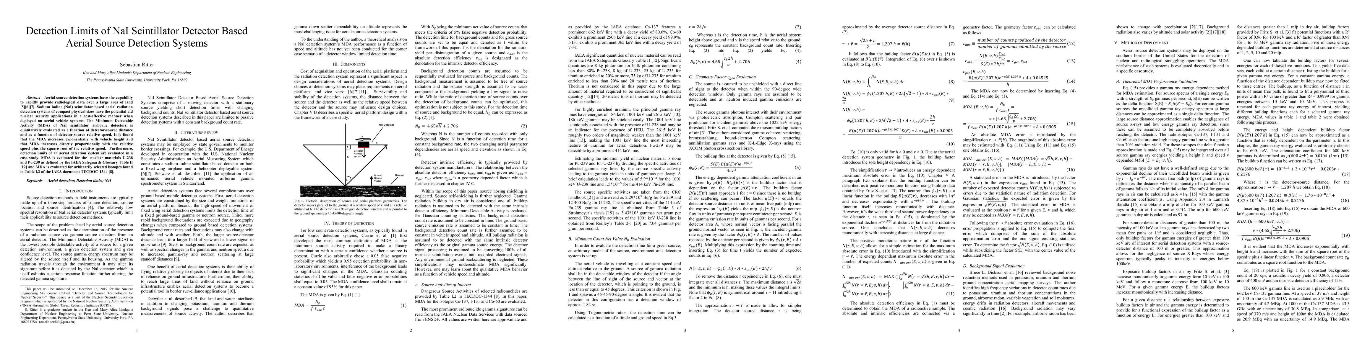 This paper evaluates the Minimum Detectable Activity (MDA) of NaI scintillator detectors used in aerial radiological source detection systems, finding that MDA increases exponentially with vehicle height and proportionally with relative speed. A case study assesses MDA for nuclear materials like U-238 and Pu-239, and other selected isotopes.