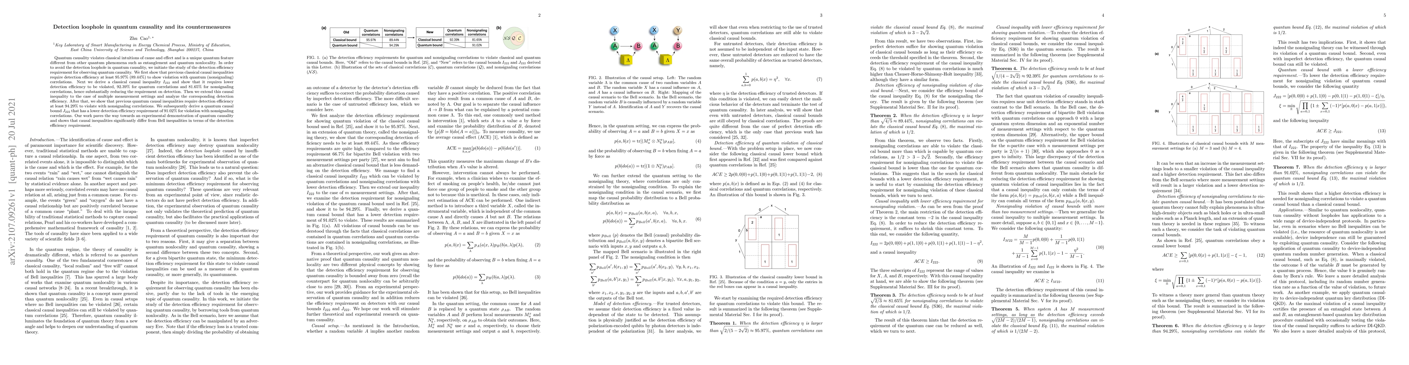 Quantum causality violates classical intuitions of cause and effect and is a unique quantum feature different from other quantum phenomena such as entanglement and quantum nonlocality. In order to avoid the detection loophole in quantum causality, we initiate the study of the detection efficiency requirement for observing quantum causality. We first show that previous classical causal inequalities require detection efficiency at least 95.97% (89.44%) to show violation with quantum (nonsignaling) correlations. Next we derive a classical causal inequality I_{222} and show that it requires lower detection efficiency to be violated, 92.39% for quantum correlations and 81.65% for nonsignaling correlations, hence substantially reducing the requirement on detection. Then we extend this causal inequality to the case of multiple measurement settings and analyze the corresponding detection efficiency. After that, we show that previous quantum causal inequalities require detection efficiency at least 94.29% to violate with nonsignaling correlations. We subsequently derive a quantum causal bound J_{222} that has a lower detection efficiency requirement of 91.02% for violation with nonsignaling correlations. Our work paves the way towards an experimental demonstration of quantum causality and shows that causal inequalities significantly differ from Bell inequalities in terms of the detection efficiency requirement.