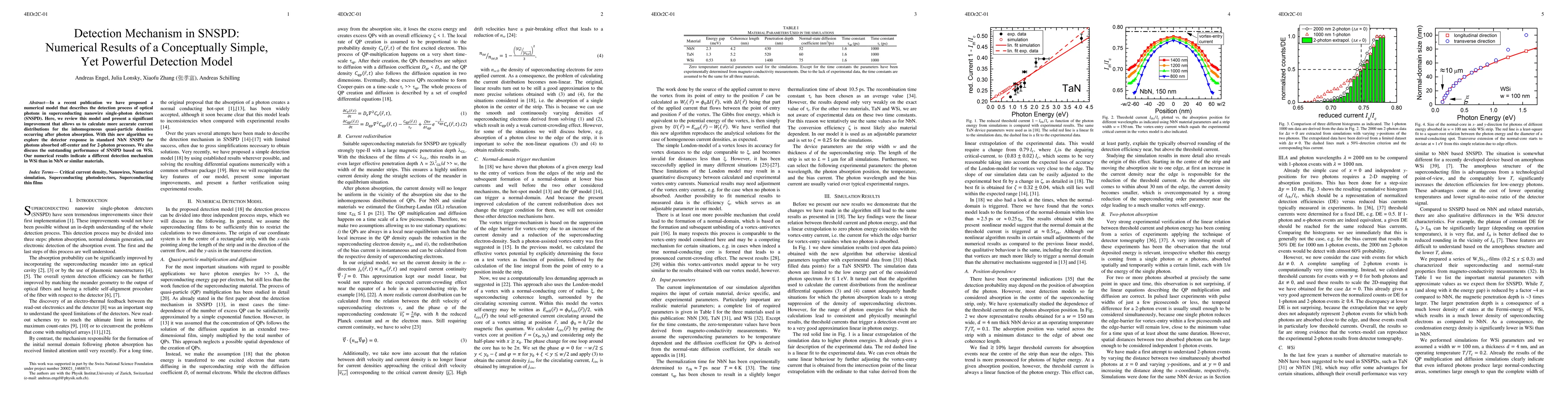 The paper improves a numerical model to accurately predict current distributions in Superconducting Nanowire Single-Photon Detectors (SNSPD), particularly for off-center photon absorption and two-photon processes. It reveals a distinct detection mechanism in WSi compared to NbN, highlighting material-specific performance differences.