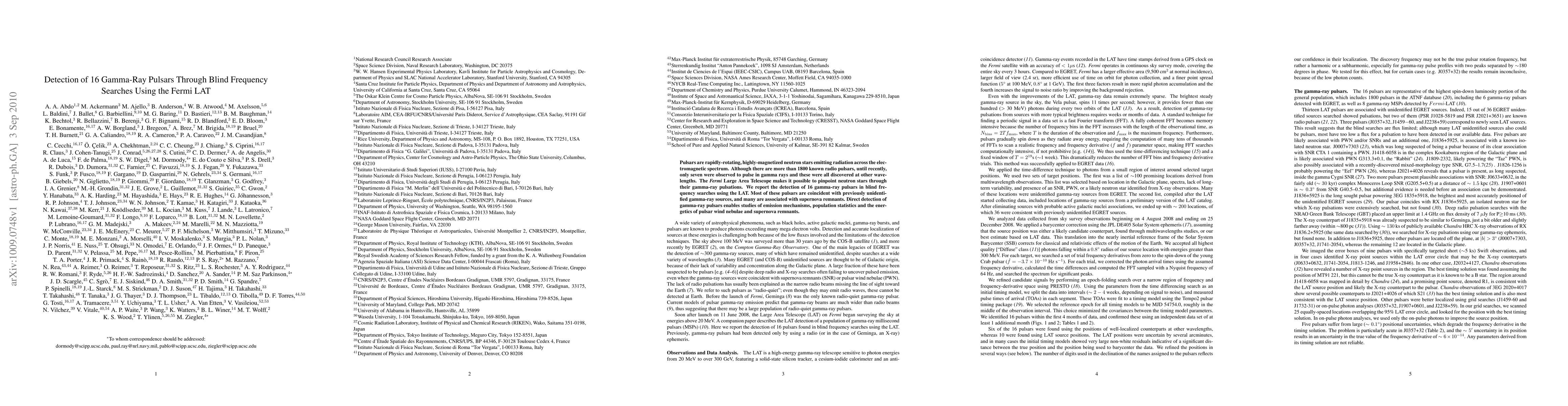 The Fermi Large Area Telescope (LAT) has detected 16 gamma-ray pulsars through blind frequency searches, significantly expanding the known population of gamma-ray pulsars. These findings enhance our understanding of pulsar emission mechanisms and the energetics of pulsar wind nebulae and supernova remnants.