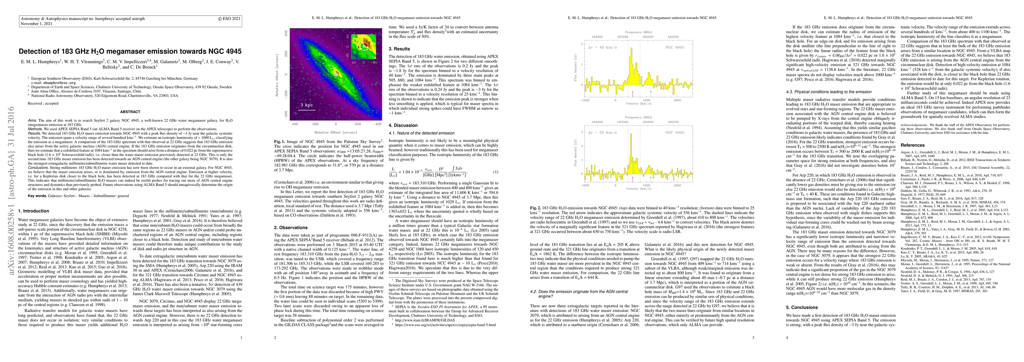 This study detected strong 183 GHz water megamaser emission from the Seyfert 2 galaxy NGC 4945, indicating that the emission likely originates from the active galactic nucleus, potentially closer to the supermassive black hole than previously observed at 22 GHz. This discovery highlights the utility of millimeter/submillimeter water masers in probing AGN central engine structures.