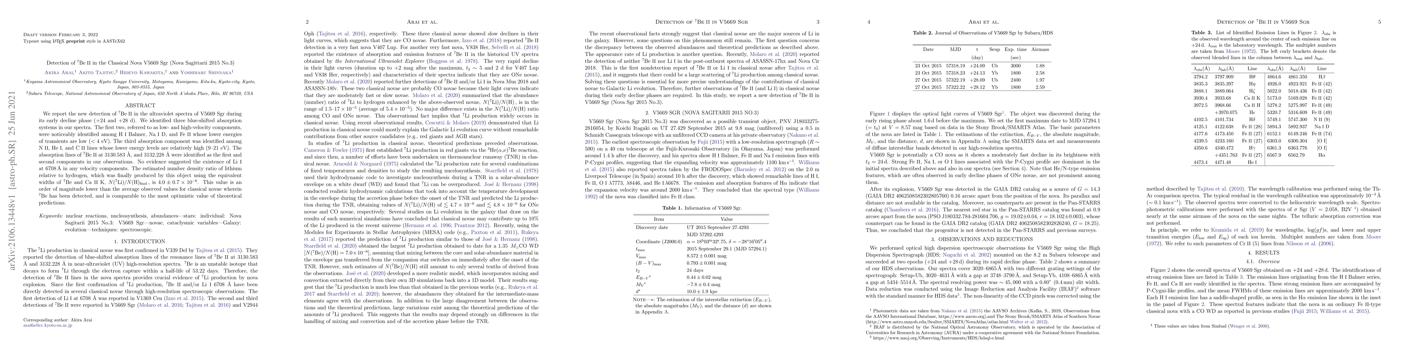 We report the new detection of $^7$Be II in the ultraviolet spectra of V5669 Sgr during its early decline phase ($+24$ and $+28$ d). We identified three blue-shifted absorption systems in our spectra. The first two, referred to as low- and high-velocity components, were noticeably identified among H I Balmer, Na I D, and Fe II whose lower energies of transients are low ($<4$ eV). The third absorption component was identified among N II, He I, and C II lines whose lower energy levels are relatively high (9--21 eV). The absorption lines of $^7$Be II at $3130.583$ {\AA}, and $3132.228$ {\AA} were identified as the first and second components in our observations. No evidence suggested the existence of Li I at 6708 {\AA} in any velocity components. The estimated number density ratio of lithium relative to hydrogen, which was finally produced by this object using the equivalent widths of $^7$Be and Ca II K, $N({\rm ^{7}Li})/N({\rm H})_{\rm final}$ is $4.0\pm0.7\times10^{-6}$. This value is an order of magnitude lower than the average observed values for classical novae wherein $^7$Be has been detected, and is comparable to the most optimistic value of theoretical predictions.