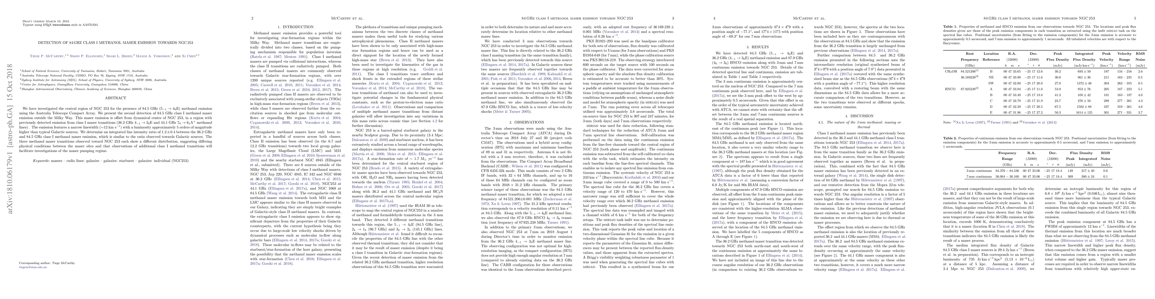 This study reports the second detection of 84.5-GHz class I methanol maser emission in NGC 253, revealing a narrow linewidth and significantly higher luminosity compared to typical Galactic sources. The maser emission is offset from NGC 253's dynamical center and shows distinct spatial distributions from other methanol maser transitions.