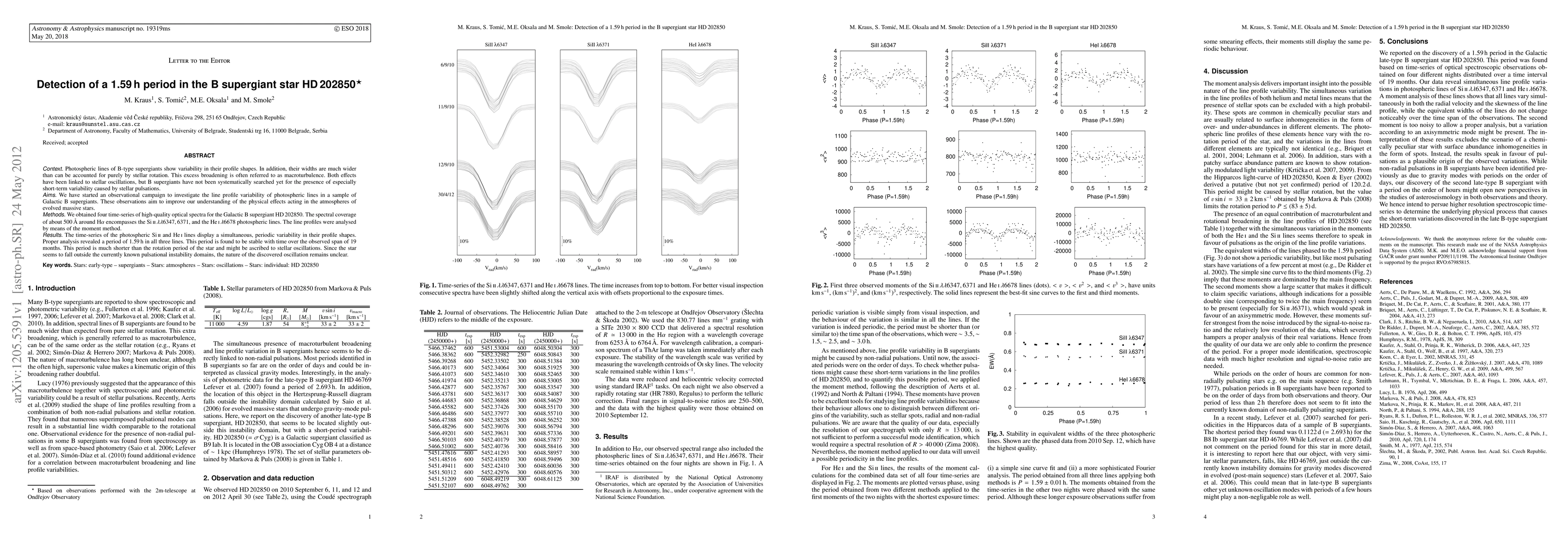 Photospheric lines of B-type supergiants show variability in their profile shapes. In addition, their widths are much wider than can be accounted for purely by stellar rotation. This excess broadening is often referred to as macroturbulence. Both effects have been linked to stellar oscillations, but B supergiants have not been systematically searched yet for the presence of especially short-term variability caused by stellar pulsations. We have started an observational campaign to investigate the line profile variability of photospheric lines in a sample of Galactic B supergiants. These observations aim to improve our understanding of the physical effects acting in the atmospheres of evolved massive stars. We obtained four time-series of high-quality optical spectra for the Galactic B supergiant HD 202850. The spectral coverage of about 500 A around Halpha encompasses the Si II (6347 A, 6371 A), and the He I (6678 A) photospheric lines. The line profiles were analysed by means of the moment method. The time-series of the photospheric Si II and He I lines display a simultaneous, periodic variability in their profile shapes. Proper analysis revealed a period of 1.59 h in all three lines. This period is found to be stable with time over the observed span of 19 months. This period is much shorter than the rotation period of the star and might be ascribed to stellar oscillations. Since the star seems to fall outside the currently known pulsational instability domains, the nature of the discovered oscillation remains unclear.