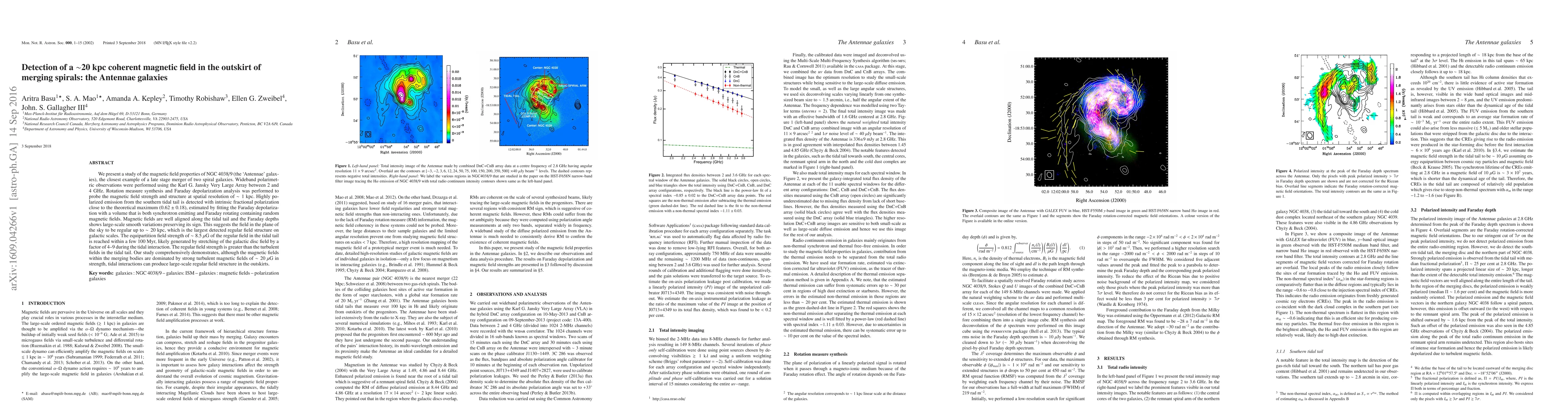 We present a study of the magnetic field properties of NGC 4038/9 (the `Antennae' galaxies), the closest example of a late stage merger of two spiral galaxies. Wideband polarimetric observations were performed using the Karl G. Jansky Very Large Array between 2 and 4 GHz. Rotation measure synthesis and Faraday depolarization analysis was performed to probe the magnetic field strength and structure at spatial resolution of $\sim1$ kpc. Highly polarized emission from the southern tidal tail is detected with intrinsic fractional polarization close to the theoretical maximum ($0.62\pm0.18$), estimated by fitting the Faraday depolarization with a volume that is both synchrotron emitting and Faraday rotating containing random magnetic fields. Magnetic fields are well aligned along the tidal tail and the Faraday depths shows large-scale smooth variations preserving its sign. This suggests the field in the plane of the sky to be regular up to $\sim20$ kpc, which is the largest detected regular field structure on galactic scales. The equipartition field strength of $\sim8.5~\mu$G of the regular field in the tidal tail is reached within a few 100 Myr, likely generated by stretching of the galactic disc field by a factor of 4--9 during the tidal interaction. The regular field strength is greater than the turbulent fields in the tidal tail. Our study comprehensively demonstrates, although the magnetic fields within the merging bodies are dominated by strong turbulent magnetic fields of $\sim20~\mu$G in strength, tidal interactions can produce large-scale regular field structure in the outskirts.