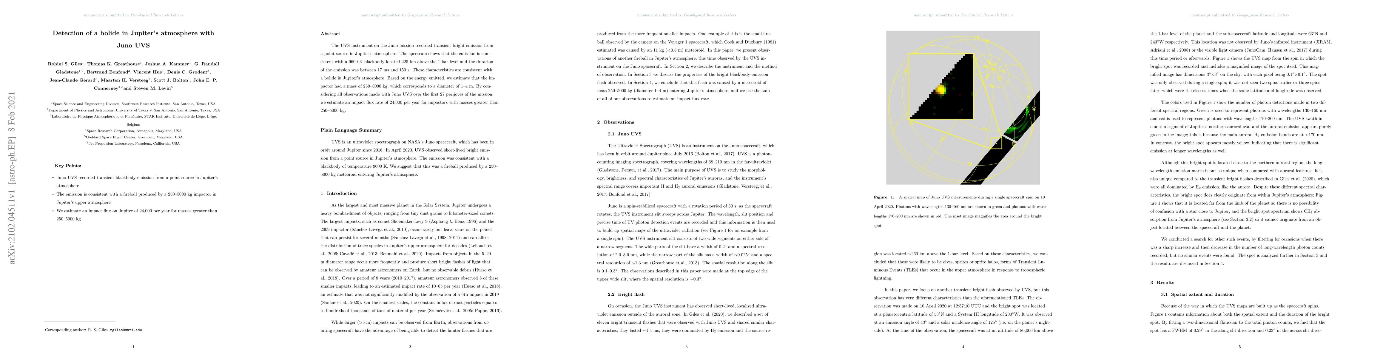 The Juno mission's UVS instrument detected a bolide in Jupiter's atmosphere, characterized by a transient bright emission consistent with a 9600-K blackbody. The estimated impactor mass ranges from 250 to 5000 kg, suggesting a diameter of 1-4 meters, and an impact flux rate of 24,000 per year for such mass ranges.