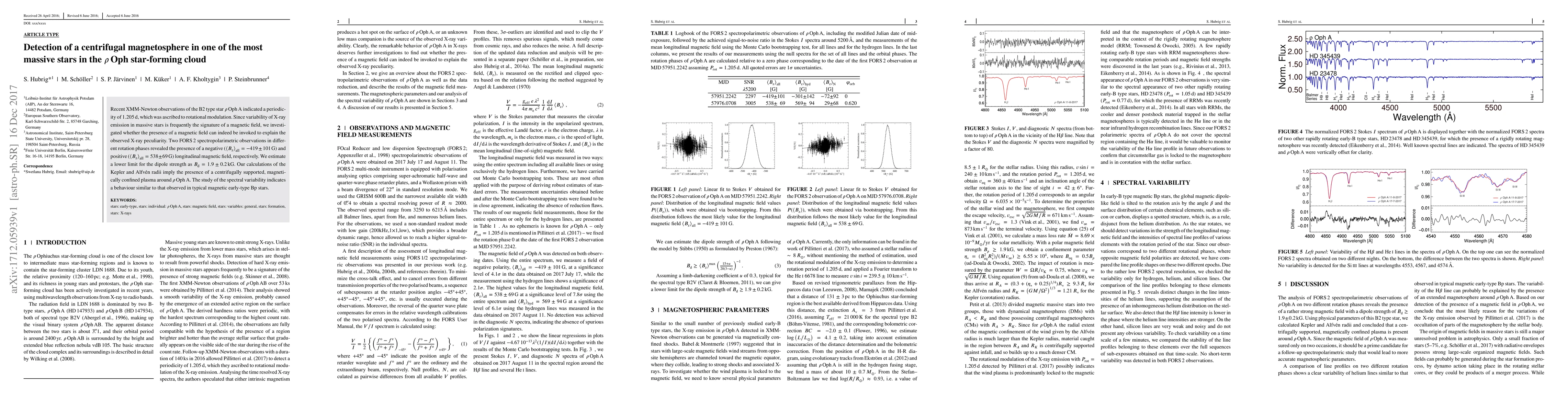 This study detected a centrifugal magnetosphere around the massive B2 star rho Oph A using XMM-Newton and FORS2 observations, revealing significant longitudinal magnetic fields and estimating a dipole strength of 1.9+-0.2kG, indicating a magnetically confined plasma.
