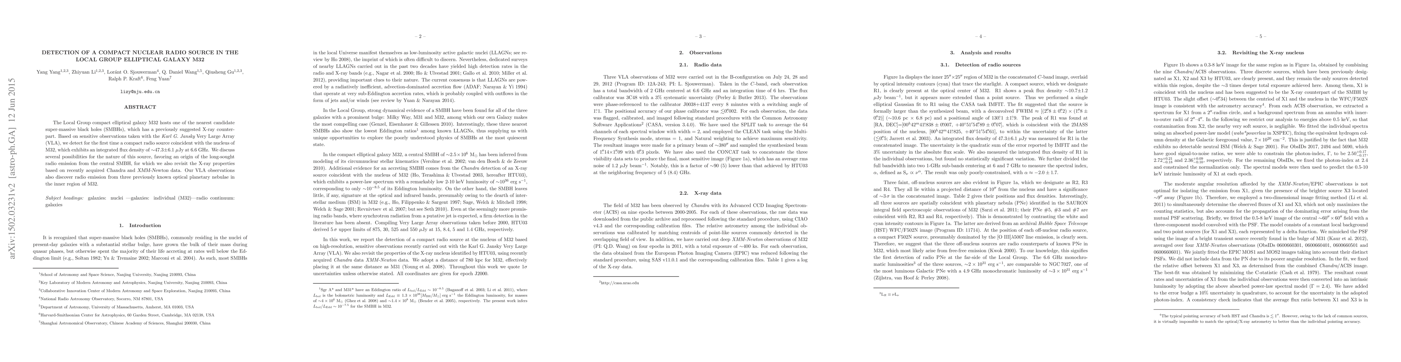 The study detects a compact radio source in the nucleus of the nearby elliptical galaxy M32, likely originating from the central supermassive black hole, using the Karl G. Jansky Very Large Array. Additionally, the research identifies radio emissions from three known planetary nebulae in M32.
