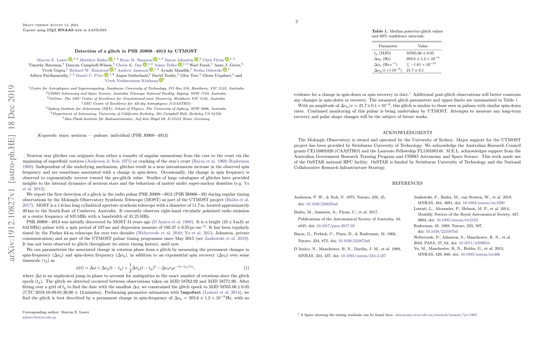 The UTMOST project detected a glitch in the radio pulsar PSR J0908$-$4913, marking its first detection, using the Molonglo Observatory Synthesis Telescope.