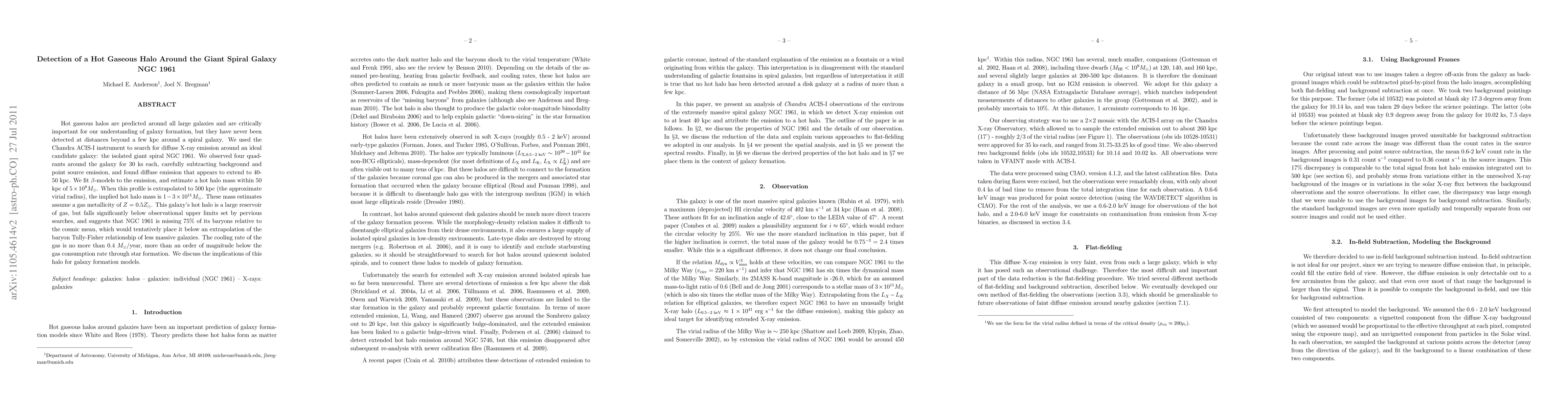 The study detected a hot gaseous halo around the giant spiral galaxy NGC 1961 using the Chandra X-ray Observatory, revealing diffuse X-ray emission extending to 40-50 kpc. The estimated hot halo mass within 50 kpc is $5\times10^9 M_{\odot}$, suggesting NGC 1961 is missing 75% of its baryons relative to the cosmic mean, impacting galaxy formation models.