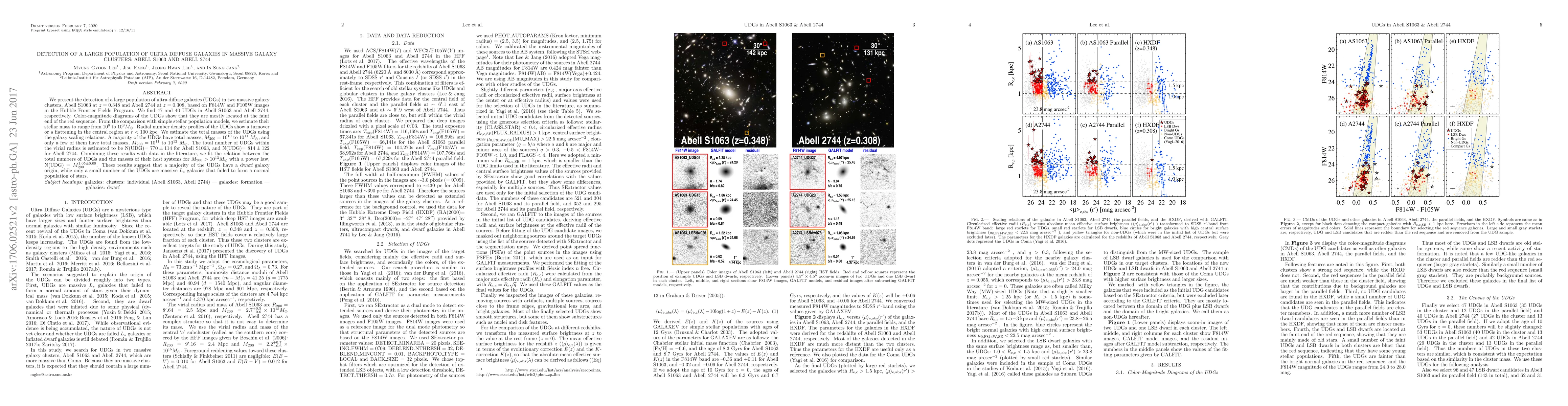 The research utilized deep HST F814W and F105W images from the Hubble Frontier Fields program to detect ultra-diffuse galaxies (UDGs) in Abell S1063 and Abell 2744, applying selection criteria consistent with those used for nearby galaxy clusters.