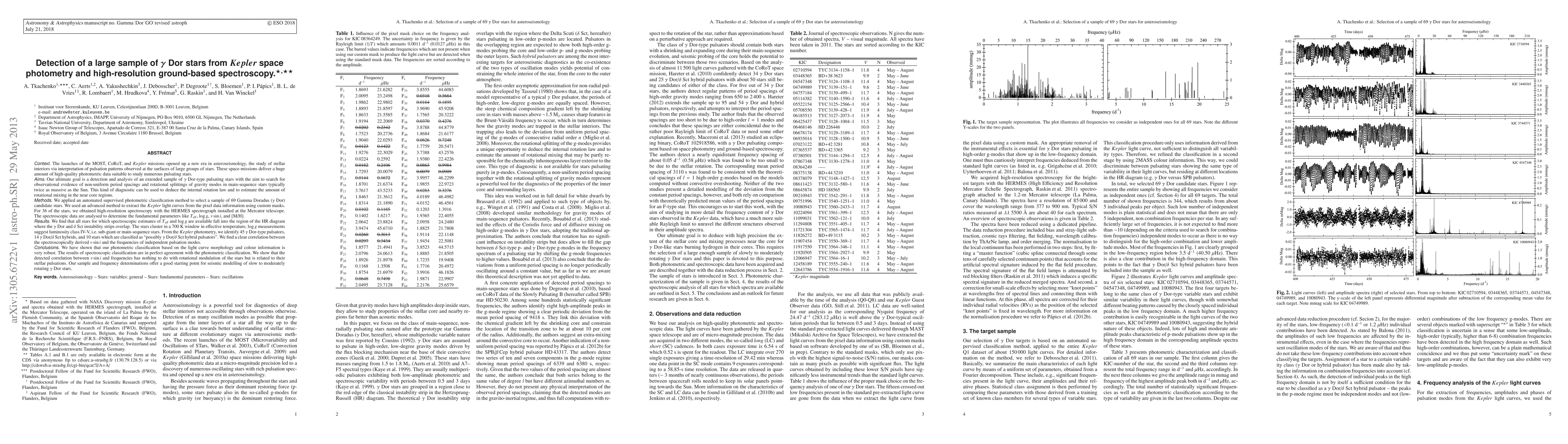 The space-missions MOST, CoRoT, and Kepler deliver a huge amount of high-quality photometric data suitable to study numerous pulsating stars. Our ultimate goal is a detection and analysis of an extended sample of Gamma Dor-type pulsating stars with the aim to search for observational evidence of non-uniform period spacings and rotational splittings of gravity modes in main-sequence stars typically twice as massive as the Sun. We applied an automated supervised photometric classification method to select a sample of 69 Gamma Doradus candidate stars. We used an advanced method to extract the Kepler light curves from the pixel data information using custom masks. For 36 of the stars, we obtained high-resolution spectroscopy with the HERMES spectrograph installed at the Mercator telescope. We find that all stars for which spectroscopic estimates of Teff and logg are available fall into the region of the HR diagram where the Gamma Dor and Delta Sct instability strips overlap. The stars cluster in a 700 K window in effective temperature, logg measurements suggest luminosity class IV-V. From the Kepler photometry, we identify 45 Gamma Dor-type pulsators, 14 Gamma Dor/Delta Sct hybrids, and 10 stars which are classified as "possibly Gamma Dor/Delta Sct hybrid pulsators". The results of photometric and spectroscopic classifications according to the type of variability are in perfect agreement. We find a clear correlation between the spectroscopically derived vsini and the frequencies of independent pulsation modes and show that it has nothing to do with rotational modulation of the stars but is related to their stellar pulsations. Our sample and frequency determinations offer a good starting point for seismic modelling of slow to moderately rotating Gamma Dor stars.