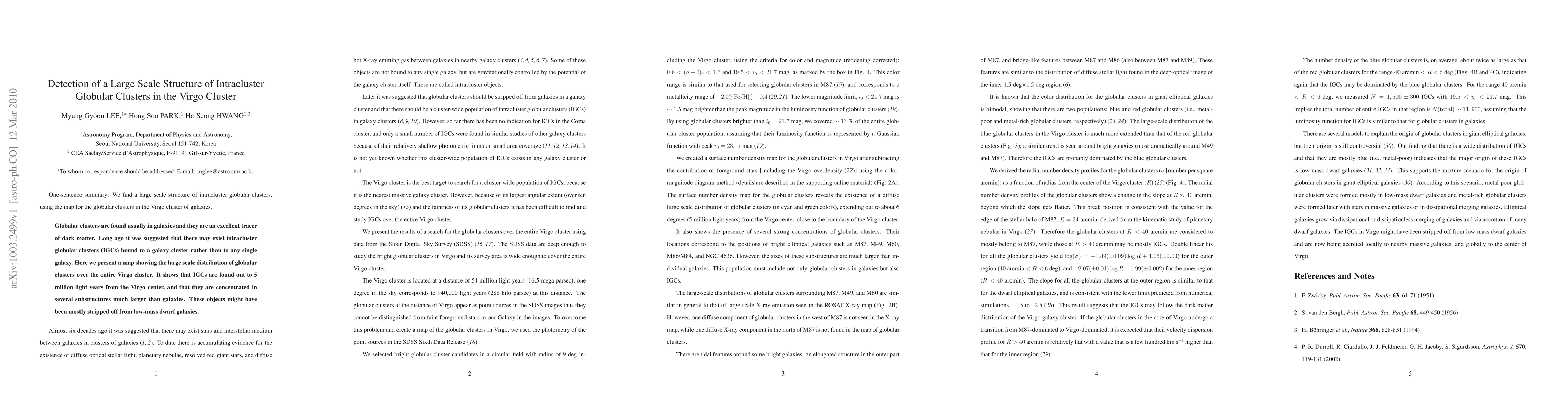 Globular clusters are found usually in galaxies and they are an excellent tracer of dark matter. Long ago it was suggested that there may exist intracluster globular clusters (IGCs) bound to a galaxy cluster rather than to any single galaxy. Here we present a map showing the large scale distribution of globular clusters over the entire Virgo cluster. It shows that IGCs are found out to 5 million light years from the Virgo center, and that they are concentrated in several substructures much larger than galaxies. These objects might have been mostly stripped off from low-mass dwarf galaxies.