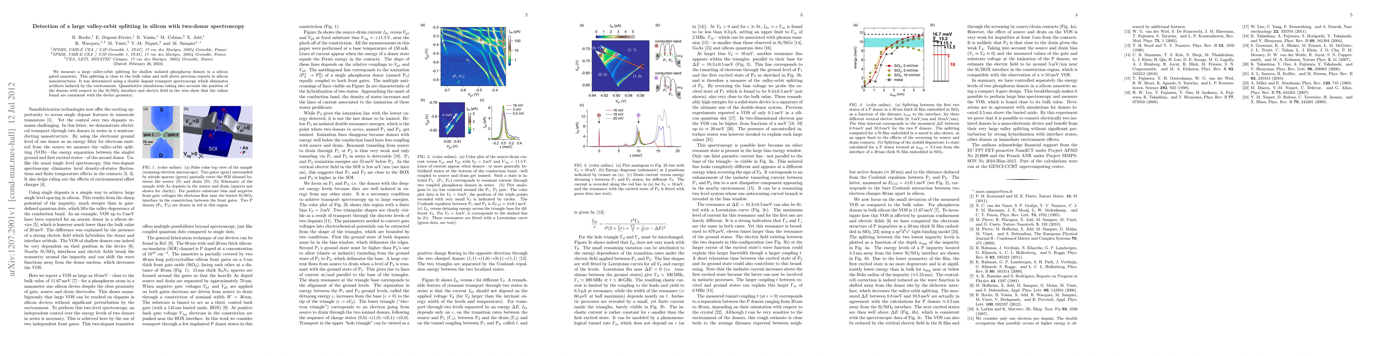 This study measures a significant valley-orbit splitting in silicon nanowires using double dopant transport spectroscopy, revealing values close to bulk silicon and higher than previous reports. Simulations confirm the findings align with the device's geometry and electric field effects.