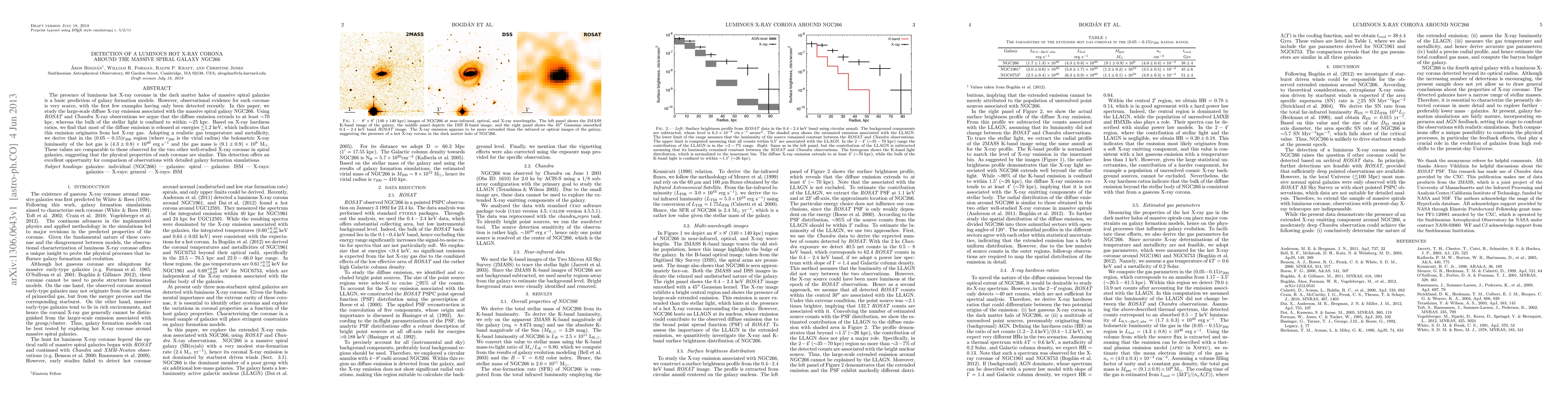 The presence of luminous hot X-ray coronae in the dark matter halos of massive spiral galaxies is a basic prediction of galaxy formation models. However, observational evidence for such coronae is very scarce, with the first few examples having only been detected recently. In this paper, we study the large-scale diffuse X-ray emission associated with the massive spiral galaxy NGC266. Using ROSAT and Chandra X-ray observations we argue that the diffuse emission extends to at least ~70 kpc, whereas the bulk of the stellar light is confined to within ~25 kpc. Based on X-ray hardness ratios, we find that most of the diffuse emission is released at energies <1.2 keV, which indicates that this emission originates from hot X-ray gas. Adopting a realistic gas temperature and metallicity, we derive that in the (0.05-0.15)r_200 region (where r_200 is the virial radius) the bolometric X-ray luminosity of the hot gas is (4.3 +/- 0.8) x 10^40 erg/s and the gas mass is (9.1 +/- 0.9) x 10^9 M_sun. These values are comparable to those observed for the two other well-studied X-ray coronae in spiral galaxies, suggesting that the physical properties of such coronae are similar. This detection offers an excellent opportunity for comparison of observations with detailed galaxy formation simulations.