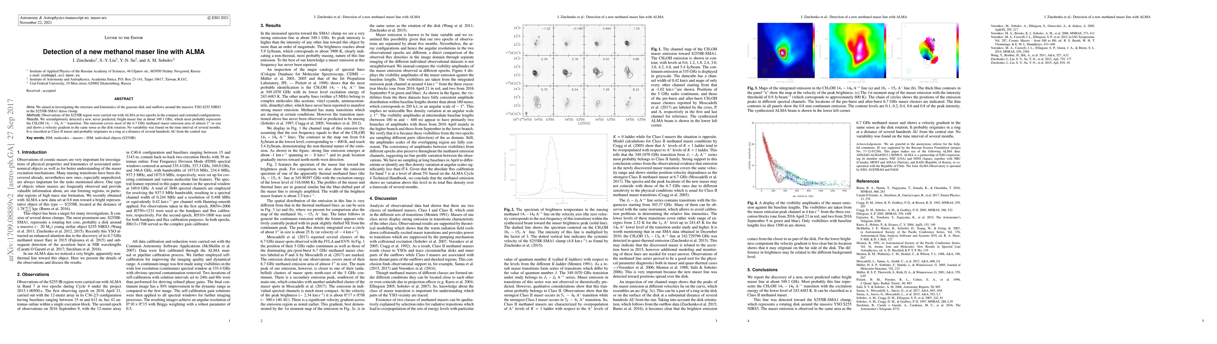 Researchers detected a new methanol maser line in the S255 NIRS3 star system using ALMA, which shows characteristics of a Class II maser and is likely located near a ring at several hundred AU from the central star. The maser emission covers an area of 1'' and has a velocity gradient similar to disk rotation.