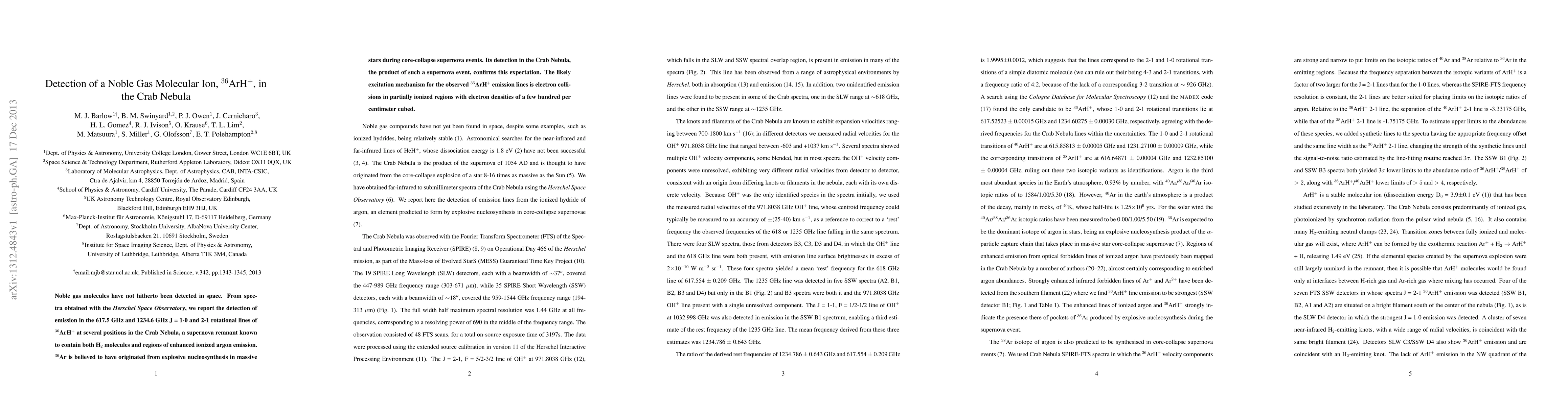 A spectroscopic survey of the Crab Nebula using the SPIRE-FTS instrument was conducted to detect and characterize the 36ArH J=1-0 and J=2-1 rotational lines.