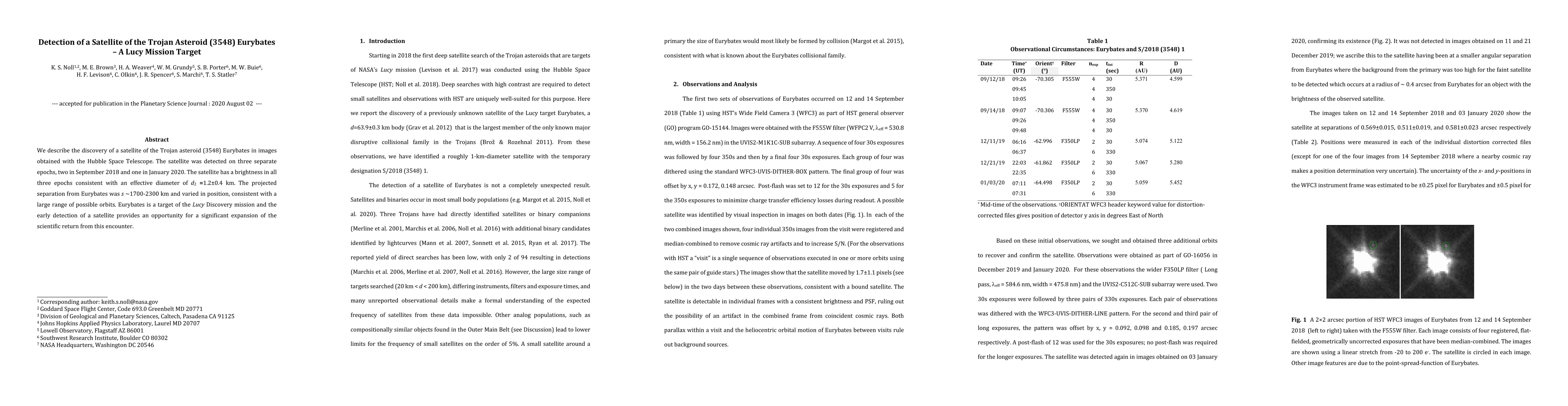 The Hubble Space Telescope discovered a satellite of the Trojan asteroid (3548) Eurybates, with a diameter of 1.2±0.4 km, detected on three separate occasions. The satellite's varying projected separation suggests a wide range of possible orbits, enhancing the scientific value of Eurybates' upcoming encounter with the Lucy Discovery mission.