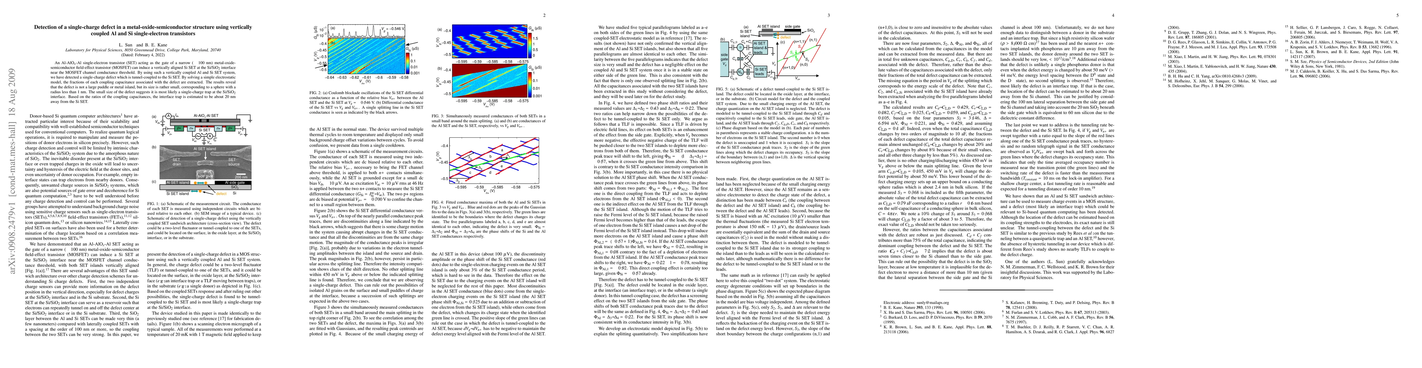 This paper reports the detection of a single-charge defect in a metal-oxide-semiconductor structure using vertically coupled Al and Si single-electron transistors. The study reveals that the defect, likely a single-charge trap at the Si/SiO_2 interface, is small, with a radius less than 1 nm, and located approximately 20 nm from the Si SET.