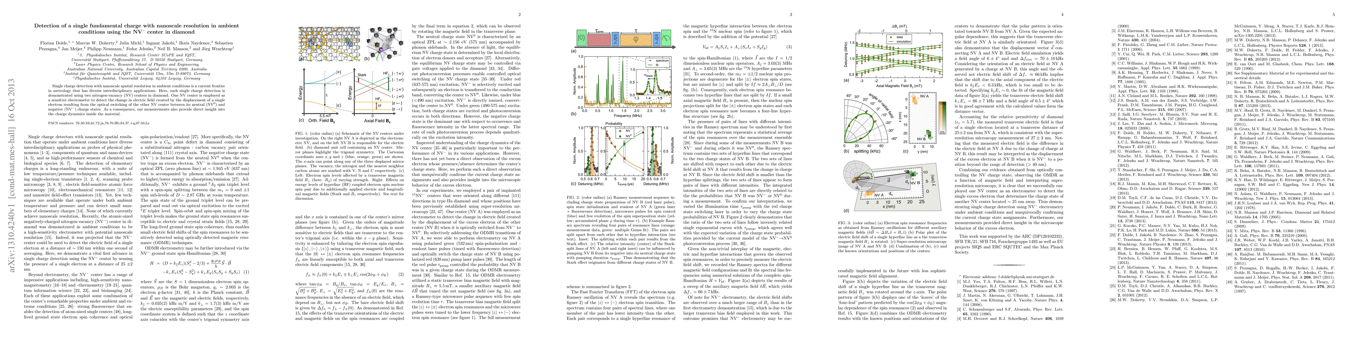 This paper demonstrates single charge detection with nanoscale resolution using NV centers in diamond, employing one NV center as an electrometer to sense the electric field change caused by the optical switching of another NV center, thus providing insights into charge dynamics.