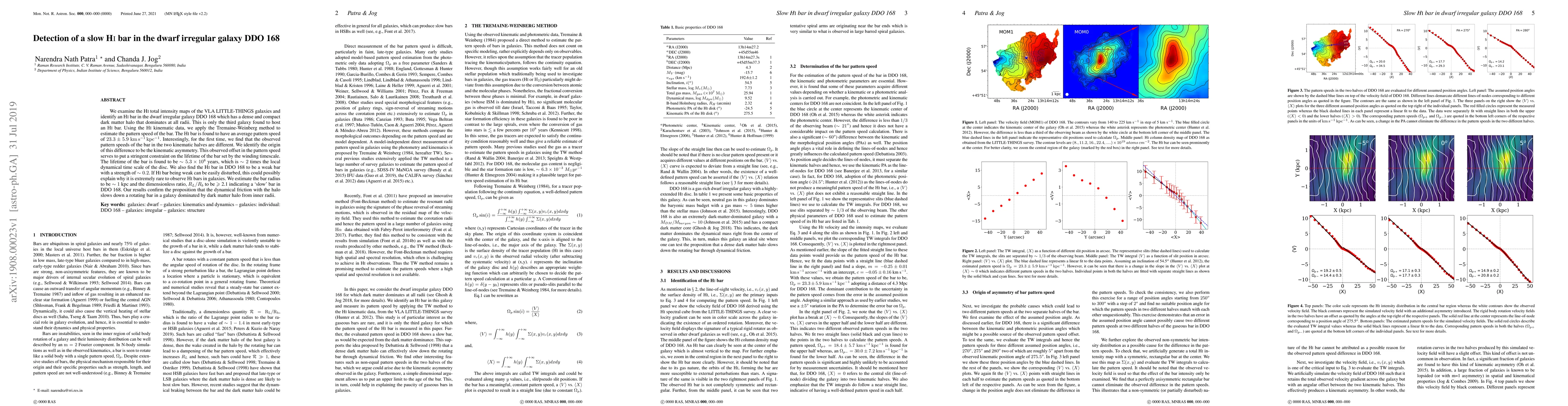 We examine the HI total intensity maps of the VLA LITTLE-THINGS galaxies and identify an HI bar in the dwarf irregular galaxy DDO 168 which has a dense and compact dark matter halo that dominates at all radii. This is only the third galaxy found to host an HI bar. Using the HI kinematic data, we apply the Tremaine-Weinberg method to estimate the pattern speed of the bar. The HI bar is found to have an average pattern speed of $23.3 \pm 5.9$ km/s/kpc. Interestingly, for the first time, we find that the observed pattern speeds of the bar in the two kinematic halves are different. We identify the origin of this difference to be the kinematic asymmetry. This observed offset in the pattern speed serves to put a stringent constraint on the lifetime of the bar set by the winding timescale. The lifetime of the bar is found to be $\sim 5.3 \times 10^8$ years, which is $\sim 2$ times the local dynamical time scale of the disc. We also find the HI bar in DDO 168 to be a weak bar with a strength of $\sim 0.2$. If HI bar being weak can be easily disturbed, this could possibly explain why it is extremely rare to observe HI bars in galaxies. We estimate the bar radius to be $\sim 1$ kpc and the dimensionless ratio, $R_L/R_b$ to be $\geq$ 2.1 indicating a `slow' bar in DDO 168. Our results confirm the proposition that the dynamical friction with the halo slows down a rotating bar in a galaxy dominated by dark matter halo from inner radii.