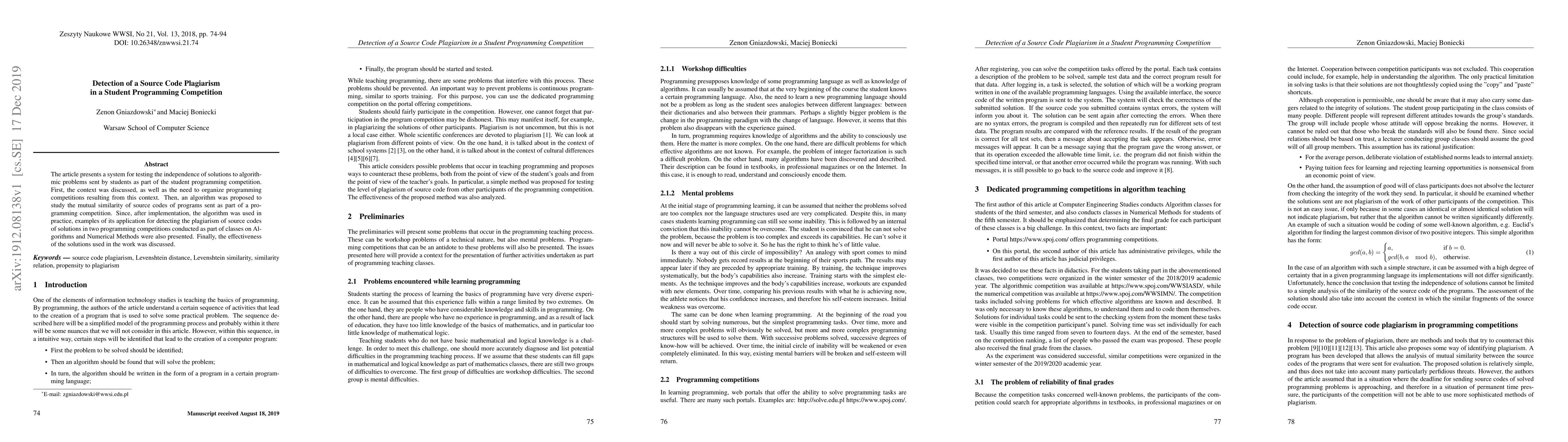 The article presents a system for testing the independence of solutions to algorithmic problems sent by students as part of the student programming competition. First, the context was discussed, as well as the need to organize programming competitions resulting from this context. Then, an algorithm was proposed to study the mutual similarity of source codes of programs sent as part of a programming competition. Since, after implementation, the algorithm was used in practice, examples of its application for detecting the plagiarism of source codes of solutions in two programming competitions conducted as part of classes on Algorithms and Numerical Methods were also presented. Finally, the effectiveness of the solutions used in the work was discussed.