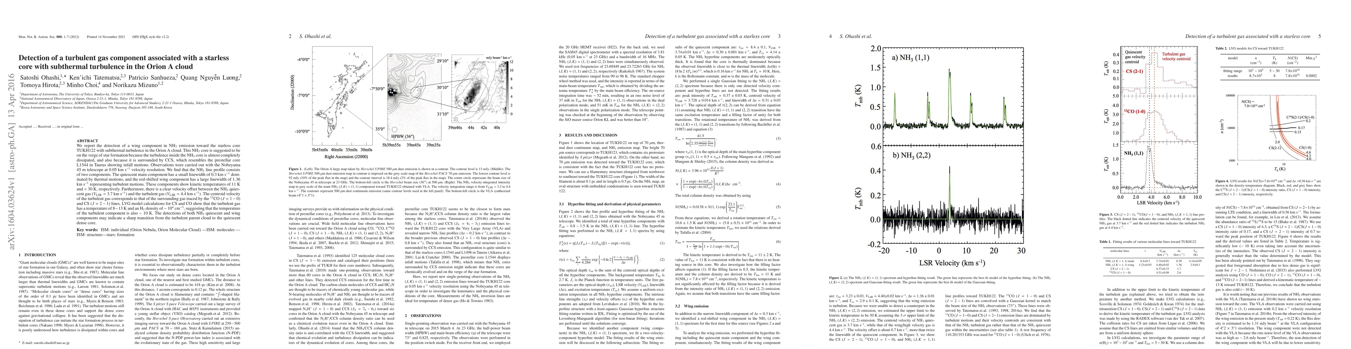 This study detected a wing component in NH$_3$ emission toward the starless core TUKH122 in the Orion A cloud, indicating subthermal turbulence. The NH$_3$ core shows a small linewidth of 0.3 km s$^{-1}$ for the main component and a large linewidth of 1.36 km s$^{-1}$ for the turbulent wing, suggesting a transition from turbulent to quiescent gas.