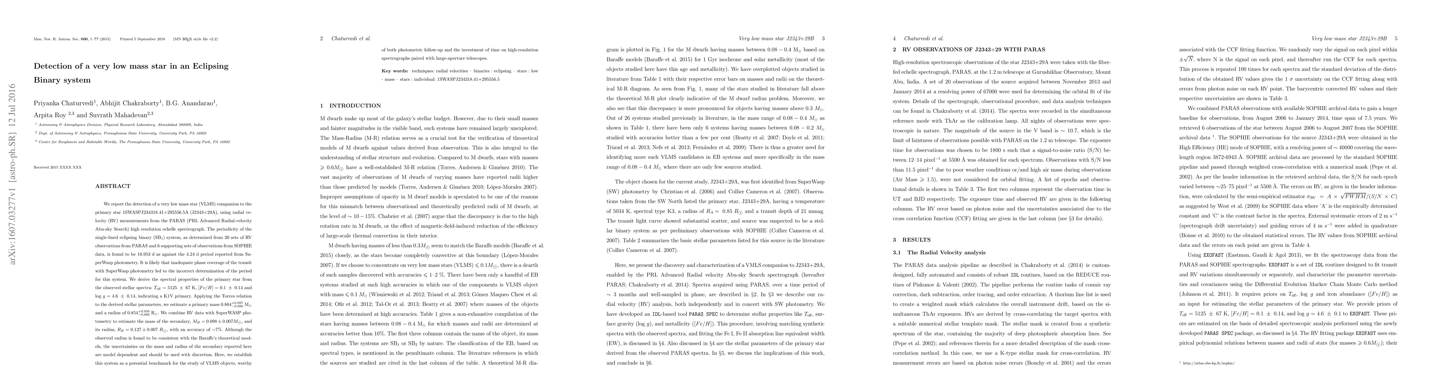 We report the detection of a very low mass star (VLMS) companion to the primary star 1SWASPJ234318.41+295556.5A (J2343+29A), using radial velocity (RV) measurements from the PARAS (PRL Advanced Radial-velocity Abu-sky Search) high resolution echelle spectrograph. The periodicity of the single-lined eclipsing binary (SB1) system, as determined from 20 sets of RV observations from PARAS and 6 supporting sets of observations from SOPHIE data, is found to be 16.953 d as against the 4.24 d period reported from SuperWasp photometry. It is likely that inadequate phase coverage of the transit with SuperWasp photometry led to the incorrect determination of the period for this system. We derive the spectral properties of the primary star from the observed stellar spectra: Teff = 5125 +/- 67 K, [Fe/H] = 0.1 +/- 0.14 and log g = 4.6 +/- 0.14, indicating a K1V primary. Applying the Torres relation to the derived stellar parameters, we estimate a primary mass 0.864 +/- 0.097 M_sun and a radius of 0.854 +/- 0.050 R_sun. We combine RV data with SuperWASP photometry to estimate the mass of the secondary, M_B = 0.098 +/- 0.007 M_sun, and its radius, R_B = 0.127 +/- 0.007 R_sun, with an accuracy of around 7%. Although the observed radius is found to be consistent with the Baraffe's theoretical models, the uncertainties on the mass and radius of the secondary reported here are model dependent and should be used with discretion. Here, we establish this system as a potential benchmark for the study of VLMS objects, worthy of both photometric follow-up and the investment of time on high-resolution spectrographs paired with large-aperture telescopes.