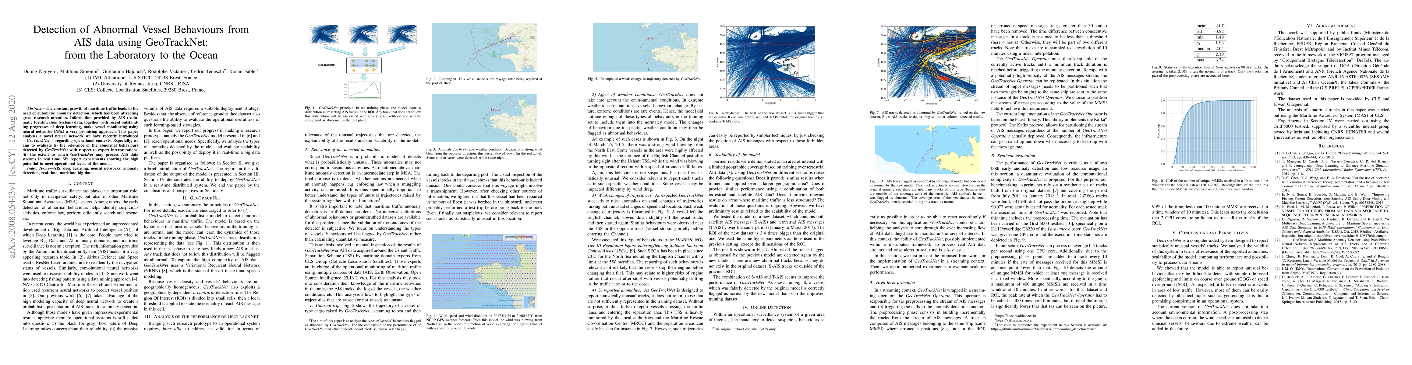 This paper introduces GeoTrackNet, a novel neural network for detecting abnormal vessel behaviours from AIS data, and evaluates its relevance and real-time processing capabilities. Experiments show promising results for operational use in vessel monitoring.
