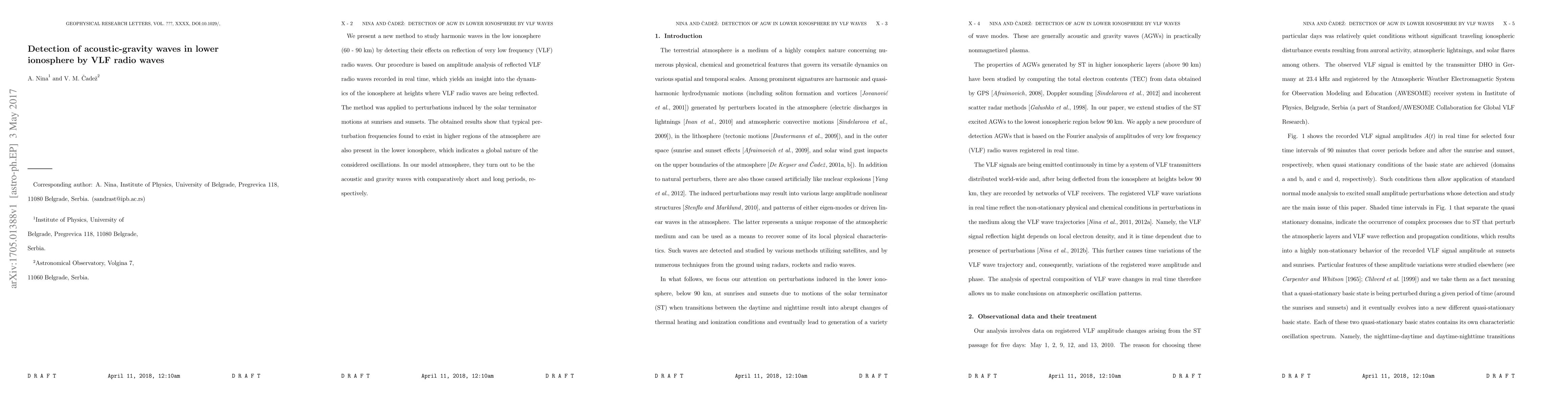 This paper introduces a novel method for detecting acoustic-gravity waves in the lower ionosphere (60-90 km) by analyzing the amplitude of reflected VLF radio waves. The findings reveal that perturbations from solar terminator motions at sunrises and sunsets indicate the presence of these waves, suggesting a global nature of atmospheric oscillations.