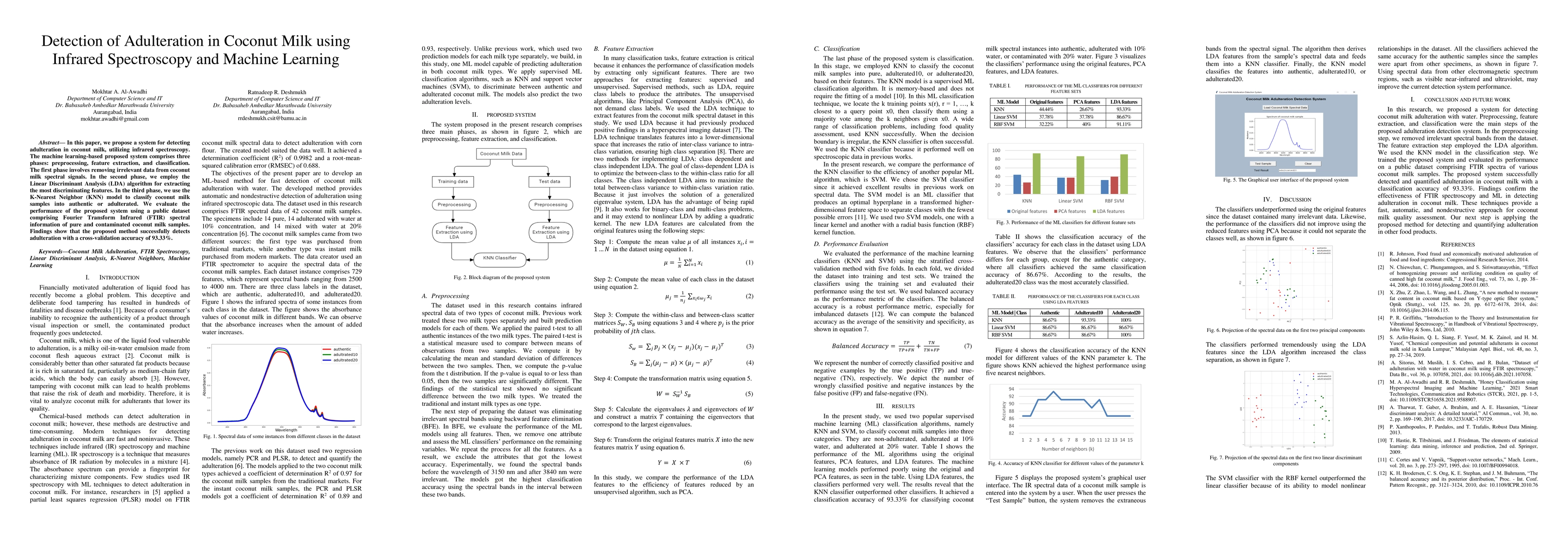 The paper presents a machine learning-based system using infrared spectroscopy for detecting coconut milk adulteration, employing LDA for feature extraction and KNN for classification.