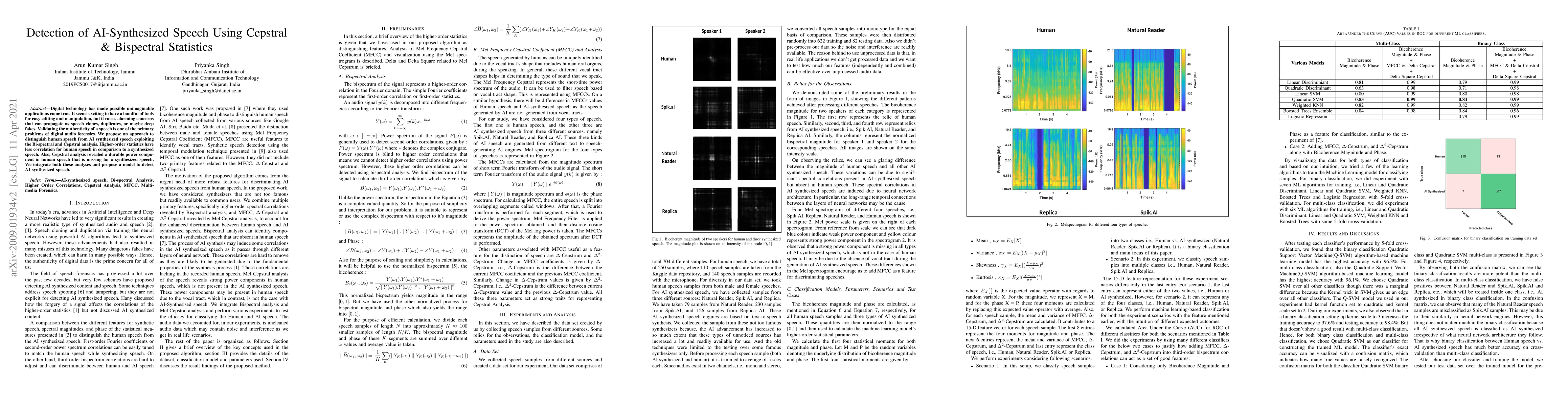 This paper proposes a method to detect AI-synthesized speech using bispectral and cepstral analysis, highlighting that human speech exhibits less correlation in higher-order statistics and lacks a durable power component compared to synthesized speech. A machine learning model is developed to distinguish between the two based on these analyses.