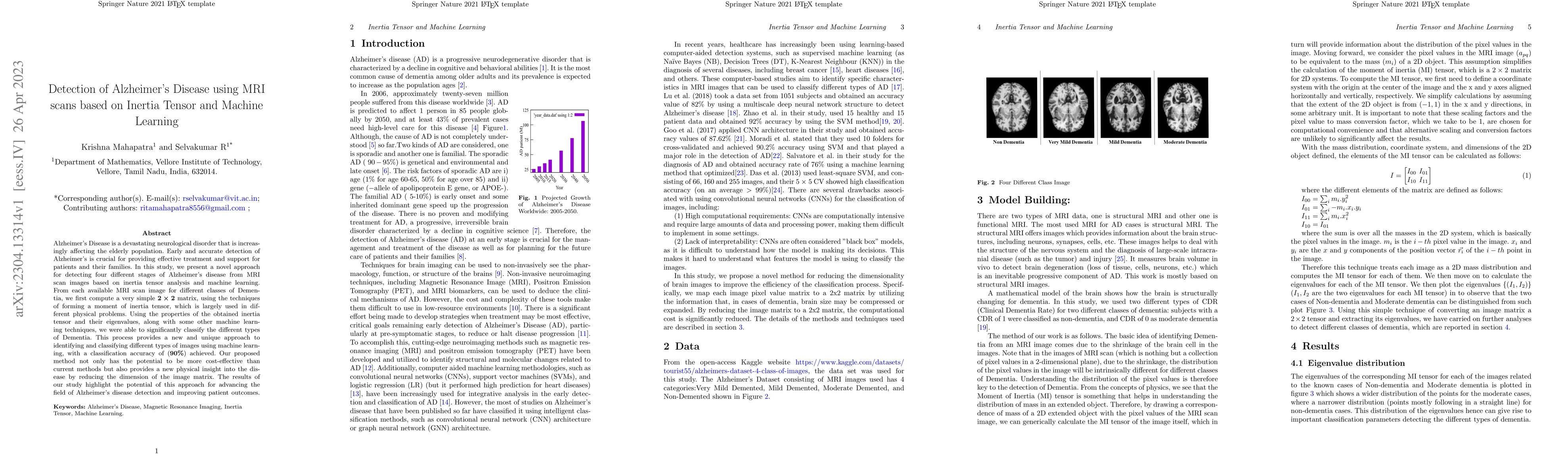 This study introduces a novel method for detecting Alzheimer's Disease stages from MRI scans using inertia tensor analysis and machine learning, achieving 90% classification accuracy. The approach offers a cost-effective alternative and provides new physical insights by reducing image dimensions.