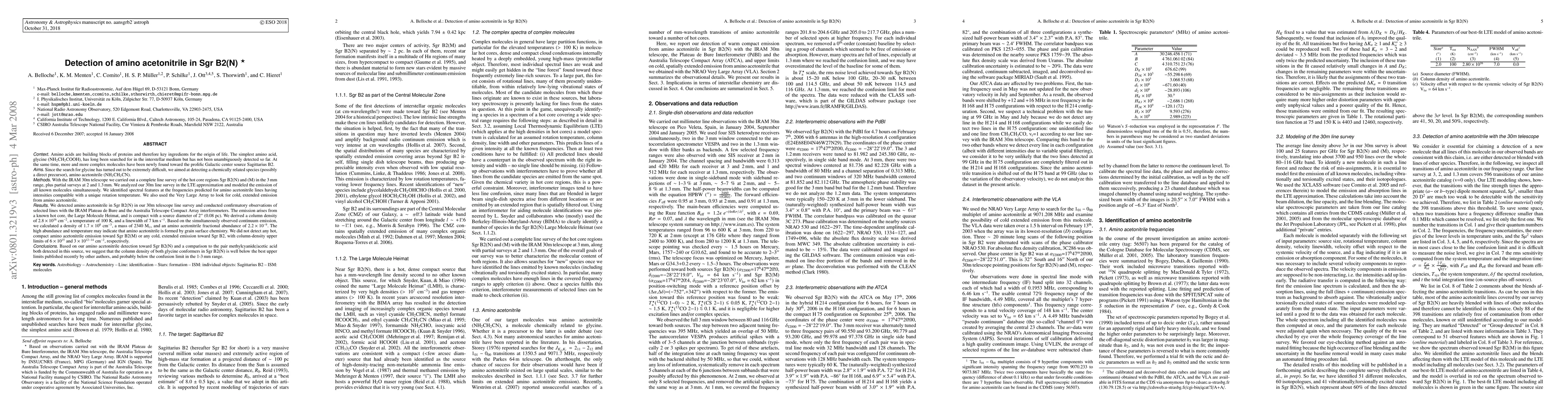 Researchers detected amino acetonitrile, a potential precursor to amino acids, in the hot core region Sgr B2(N) using the IRAM 30m telescope. They found a high fractional abundance of 2.2e-9, suggesting its formation via grain surface chemistry.
