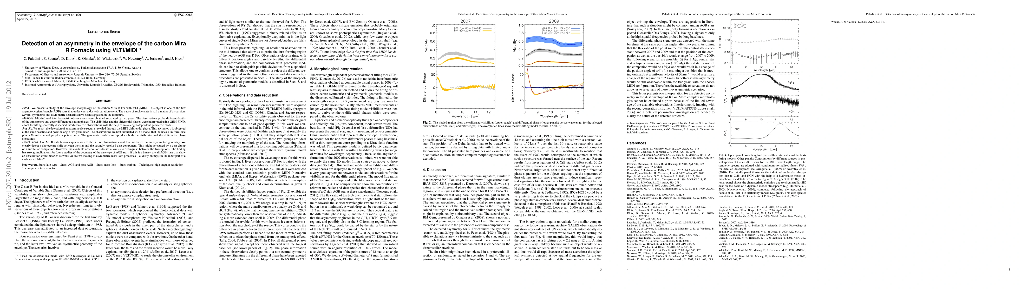 This study using VLTI/MIDI detects an asymmetric structure in the envelope of the carbon Mira star R Fornacis, observed through differential phases over two years. The findings favor explanations involving asymmetric geometry, possibly due to a dust clump or a substellar companion, with implications for understanding AGB star envelopes and potential binary nature of obscuration events.