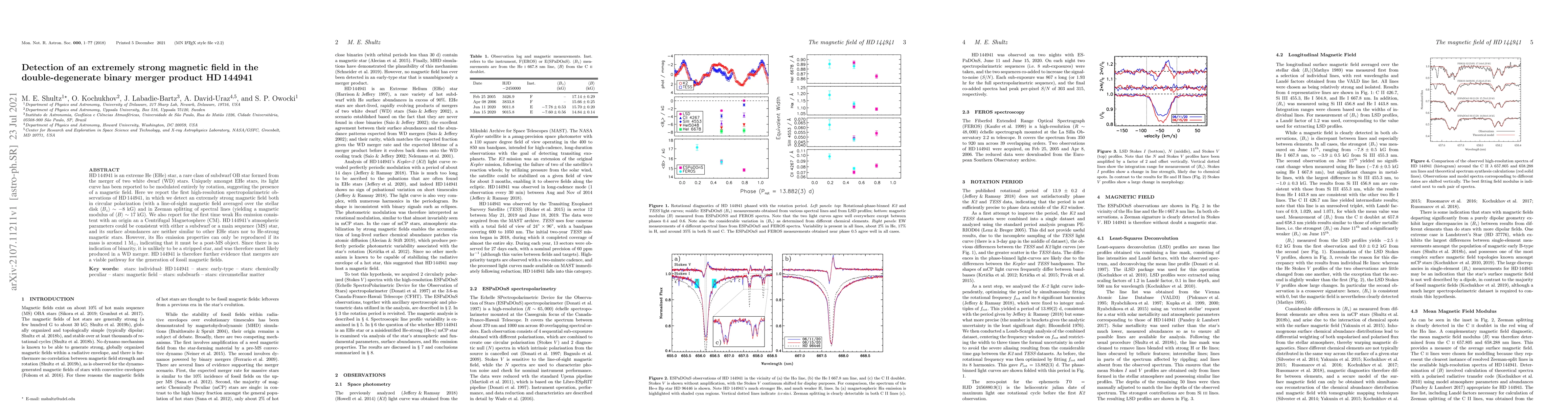 HD 144941 is an extreme He (EHe) star, a rare class of subdwarf OB star formed from the merger of two white dwarf (WD) stars. Uniquely amongst EHe stars, its light curve has been reported to be modulated entirely by rotation, suggesting the presence of a magnetic field. Here we report the first high-resolution spectropolarimetric observations of HD 144941, in which we detect an extremely strong magnetic field both in circular polarization (with a line-of-sight magnetic field averaged over the stellar disk $\langle B_z \rangle \sim -8$ kG) and in Zeeman splitting of spectral lines (yielding a magnetic modulus of $\langle B \rangle \sim 17$ kG). We also report for the first time weak H$\alpha$ emission consistent with an origin an a Centrifugal Magnetosphere (CM). HD 144941's atmospheric parameters could be consistent with either a subdwarf or a main sequence (MS) star, and its surface abundances are neither similar to other EHe stars nor to He-strong magnetic stars. However, its H$\alpha$ emission properties can only be reproduced if its mass is around 1 M$_\odot$, indicating that it must be a post-MS object. Since there is no indication of binarity, it is unlikely to be a stripped star, and was therefore most likely produced in a WD merger. HD 144941 is therefore further evidence that mergers are a viable pathway for the generation of fossil magnetic fields.