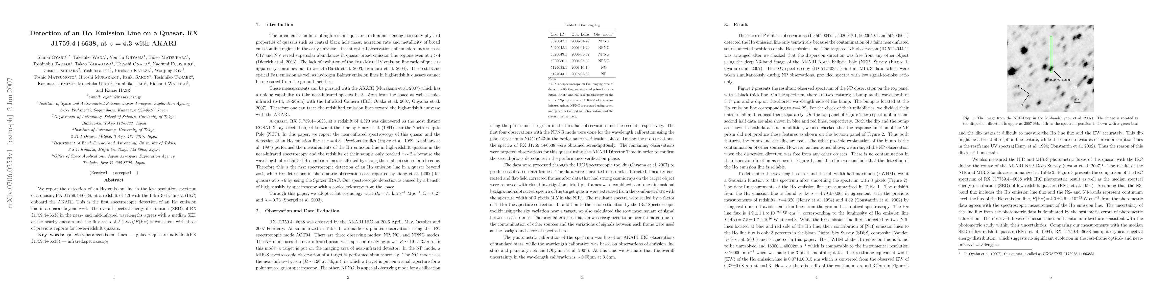 We report the detection of an H-alpha emission line in the low resolution spectrum of a quasar, RX J1759.4+6638, at a redshift of 4.3 with the InfraRed Camera (IRC) onboard the AKARI. This is the first spectroscopic detection of an H-alpha emission line in a quasar beyond z=4. The overall spectral energy distribution (SED) of RX J1759.4+6638 in the near- and mid-infrared wavelengths agrees with a median SED of the nearby quasars and the flux ratio of F(Ly-alpha)/F(H-alpha) is consistent with those of previous reports for lower-redshift quasars.
