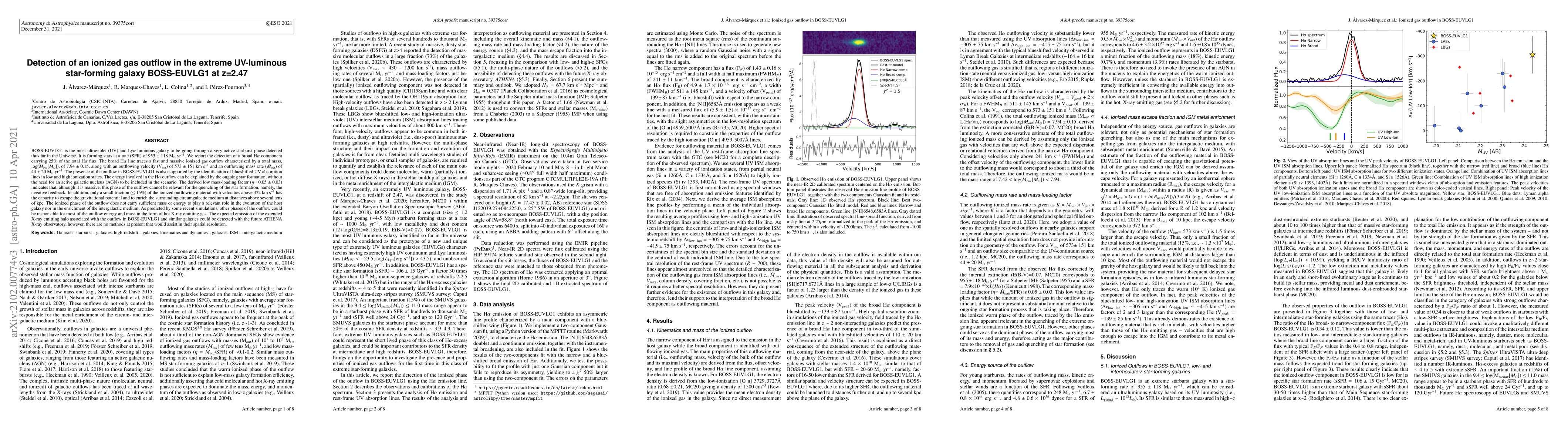 BOSS-EUVLG1 is the most ultraviolet (UV) and Ly$\alpha$ luminous galaxy detected so far in the Universe, going through a very active starburst phase, and forming stars at a rate (SFR) of 955 $\pm$ 118 M$_{\odot}$ yr$^{-1}$. We report the detection of a broad H$\alpha$ component carrying 25% of the total H$\alpha$ flux. The broad H$\alpha$ line traces a fast and massive ionized gas outflow characterized by a total mass, $\log(M_{out}[M_{\odot}]),$ of 7.94 $\pm$ 0.15, an outflowing velocity (V$_{out}$) of 573 $\pm$ 151 km s$^{-1}$, and an outflowing mass rate ($\dot{M}_{out}$) of 44 $\pm$ 20 M$_{\odot}$ yr$^{-1}$. The presence of the outflow in BOSS-EUVLG1 is also supported by the identification of blueshifted UV absorption lines in low and high ionization states. The energy involved in the H$\alpha$ outflow can be explained by the ongoing star formation without the need for an Active Galactic Nucleus. The derived low mass loading factor ($\eta$= 0.05 $\pm$ 0.03) indicates that although massive, this phase of the outflow can not be relevant for the quenching of the star formation. In addition, only a small fraction ($\leq$ 15%) of the ionized outflowing material with velocities above 372 km s$^{-1}$ could escape the gravitational potential, and enrich the surrounding circum-galactic medium at distances above tens of kpc. The ionized phase of the outflow does not carry the mass and energy to play a relevant role neither in the evolution of the host galaxy nor in the enrichment of the intergalactic medium. Other phases of the outflow could be carrying most of the outflow energy and mass in the form of hot X-ray emitting gas as predicted by some recent simulations. The expected emission of the extended X-ray emitting halo associated with the outflow in BOSS-EUVLG1 and similar galaxies could be detected with the future X-ray observatory, {\it ATHENA} but could not be resolved spatially.