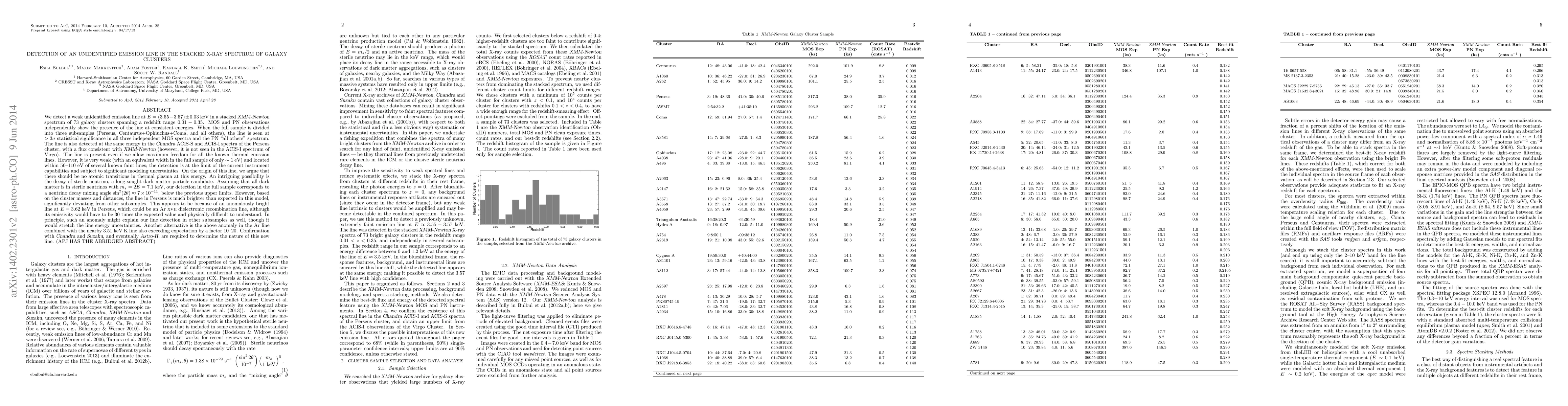 Researchers detected a weak unidentified emission line at 3.55-3.57 keV in stacked XMM spectra of 73 galaxy clusters, suggesting it may not originate from thermal plasma. The line's origin remains uncertain, with potential links to sterile neutrino decay or anomalously bright lines, but further observations are needed for confirmation.
