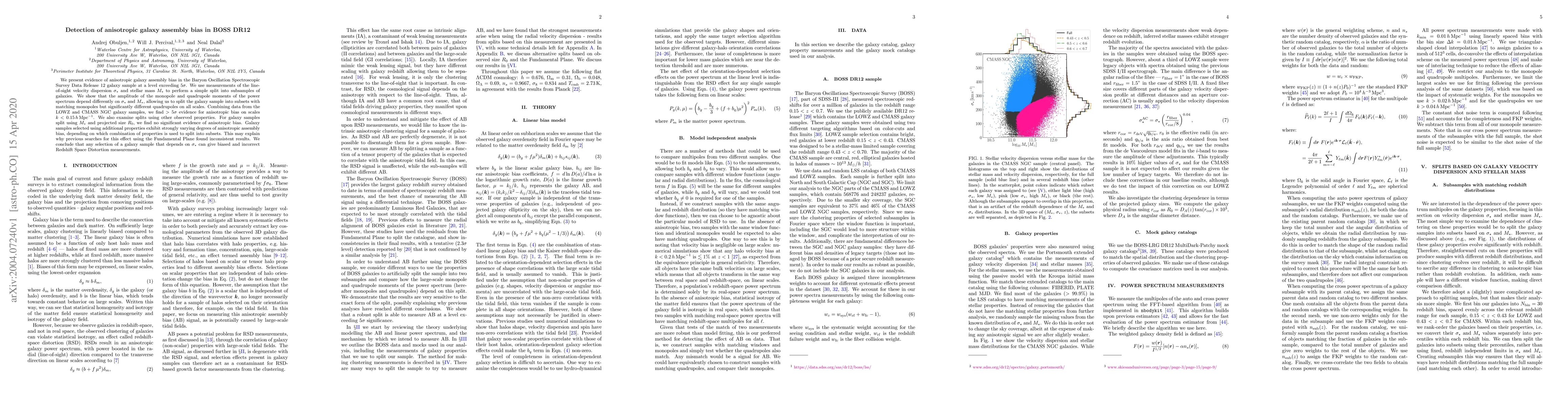 We present evidence of anisotropic galaxy assembly bias in the Baryon Oscillation Spectroscopic Survey Data Release 12 galaxy sample at a level exceeding $5\sigma$. We use measurements of the line-of-sight velocity dispersion $\sigma_\star$ and stellar mass $M_\star$ to perform a simple split into subsamples of galaxies. We show that the amplitude of the monopole and quadrupole moments of the power spectrum depend differently on $\sigma_\star$ and $M_\star$, allowing us to split the galaxy sample into subsets with matching monopoles but significantly different quadrupoles on all scales. Combining data from the LOWZ and CMASS NGC galaxy samples, we find $>5\sigma$ evidence for anisotropic bias on scales $k<0.15\,h\,\rm{Mpc}^{-1}$. We also examine splits using other observed properties. For galaxy samples split using $M_\star$ and projected size $R_0$, we find no significant evidence of anisotropic bias. Galaxy samples selected using additional properties exhibit strongly varying degrees of anisotropic assembly bias, depending on which combination of properties is used to split into subsets. This may explain why previous searches for this effect using the Fundamental Plane found inconsistent results. We conclude that any selection of a galaxy sample that depends on $\sigma_\star$ can give biased and incorrect Redshift Space Distortion measurements.