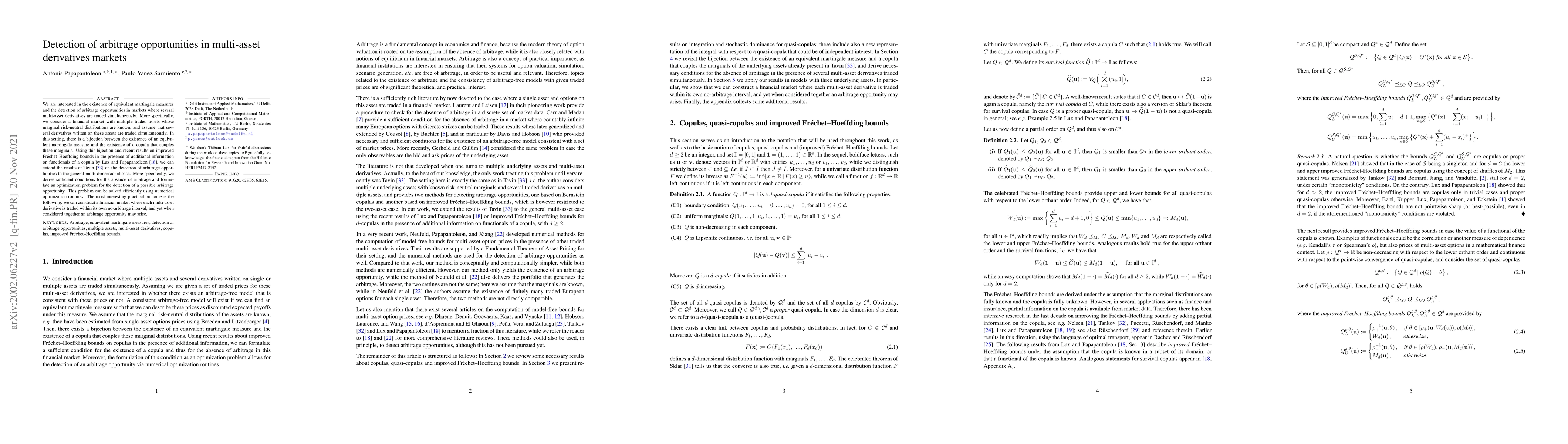 This paper investigates the detection of arbitrage opportunities in multi-asset derivatives markets by establishing a connection between equivalent martingale measures and copulas. It proposes an optimization problem to identify potential arbitrage, leveraging improved Fr\'echet-Hoeffding bounds, and demonstrates that even when individual derivatives trade within no-arbitrage intervals, combined they may still present arbitrage opportunities.