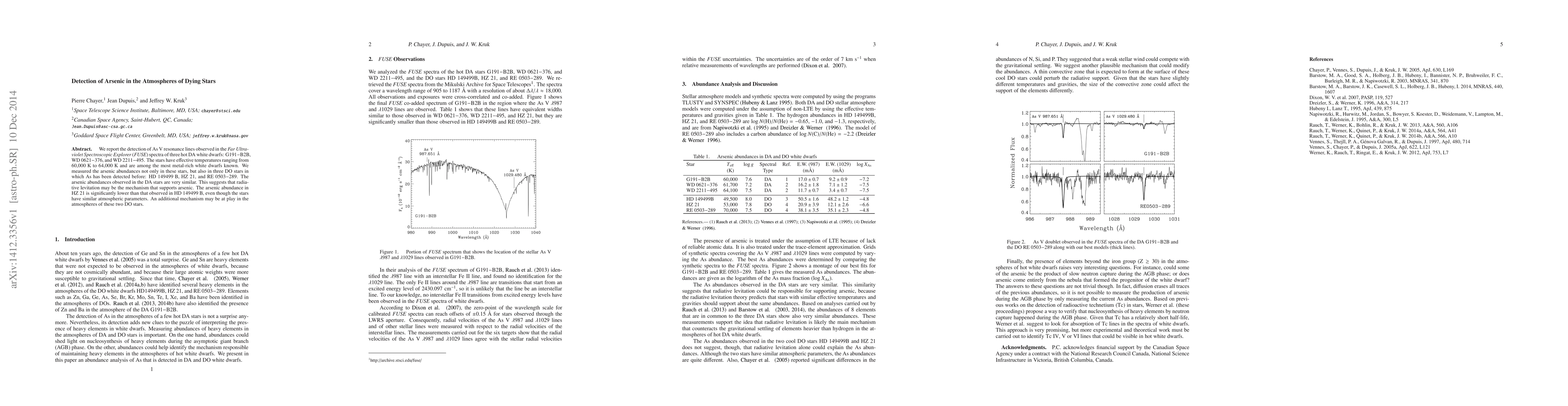 We report the detection of As V resonance lines observed in the Far Ultraviolet Spectroscopic Explorer (FUSE) spectra of three hot DA white dwarfs: G191-B2B, WD0621-376, and WD2211-495. The stars have effective temperatures ranging from 60,000 K to 64,000 K and are among the most metal-rich white dwarfs known. We measured the arsenic abundances not only in these stars, but also in three DO stars in which As has been detected before: HD149499B, HZ21, and RE0503-289. The arsenic abundances observed in the DA stars are very similar. This suggests that radiative levitation may be the mechanism that supports arsenic. The arsenic abundance in HZ21 is significantly lower than that observed in HD149499B, even though the stars have similar atmospheric parameters. An additional mechanism may be at play in the atmospheres of these two DO stars.