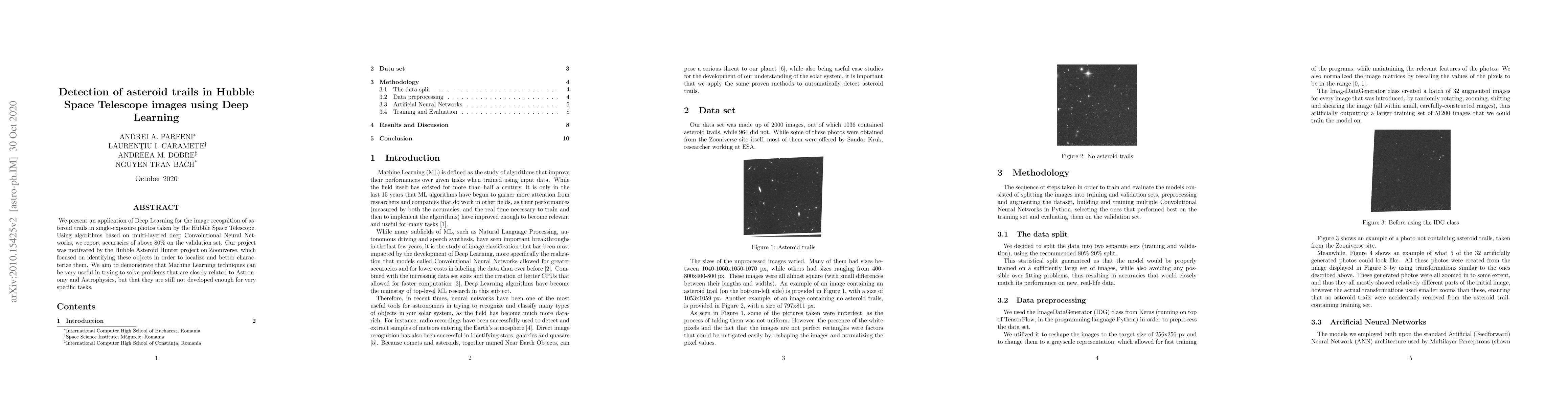 This research applies Deep Learning, specifically Convolutional Neural Networks, to detect asteroid trails in Hubble Space Telescope images, achieving over 80% accuracy. The study aims to show the potential of Machine Learning in Astronomy, though it acknowledges the need for further development for specialized tasks.
