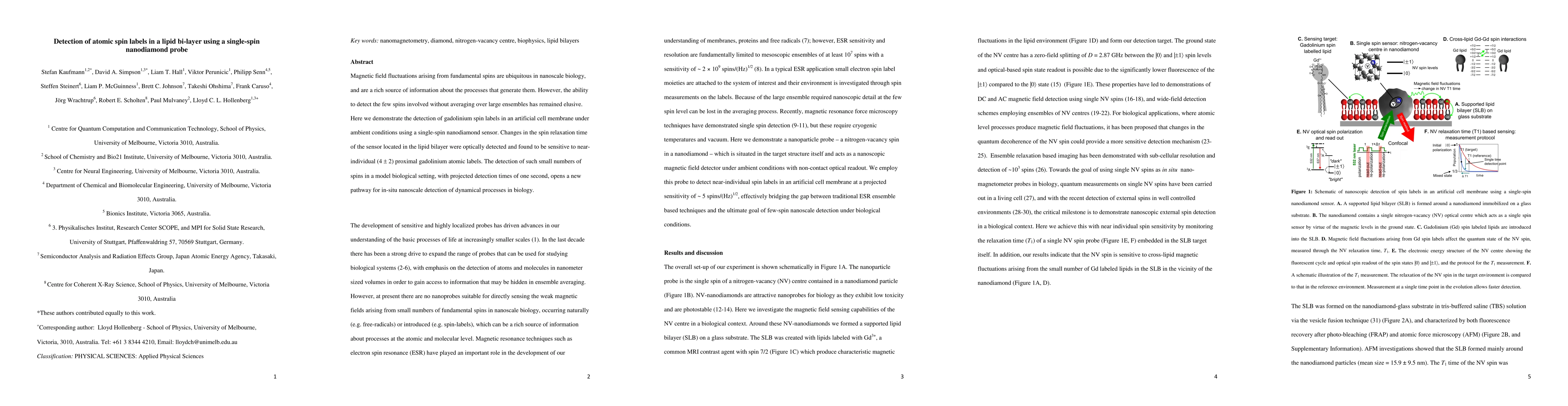 This paper demonstrates the detection of individual gadolinium spin labels in a lipid bilayer using a single-spin nanodiamond probe, revealing magnetic field fluctuations from a few spins without ensemble averaging. The method's sensitivity to near-individual labels under ambient conditions opens new pathways for in-situ nanoscale detection of biological processes.