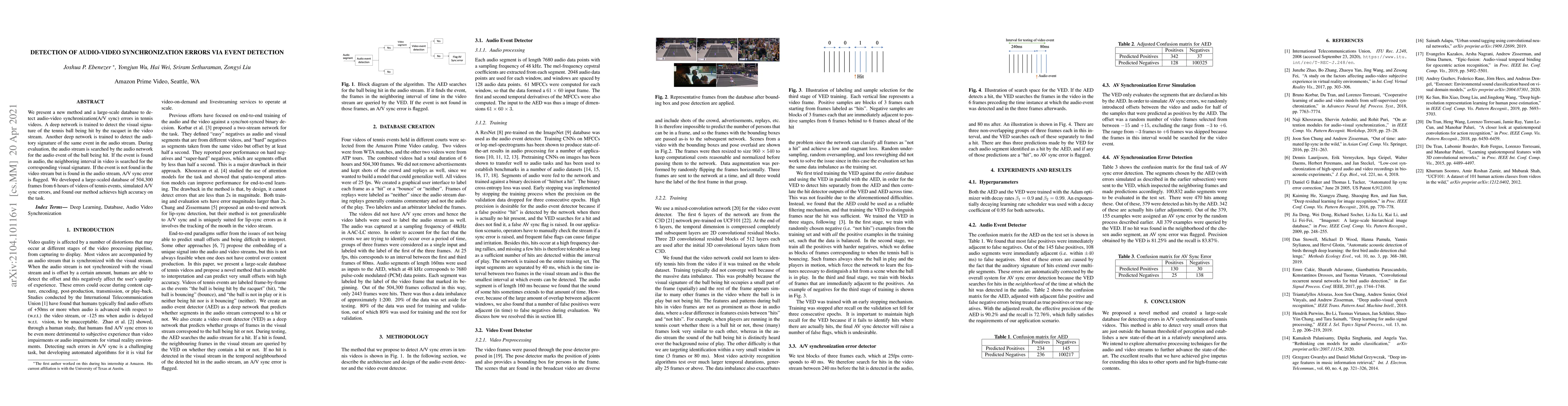 Researchers developed a method to detect audio-video synchronization errors in tennis videos using deep neural networks trained on visual and auditory signatures of the ball being hit. Their approach achieved high accuracy and was tested on a large-scale database of 504,300 frames.