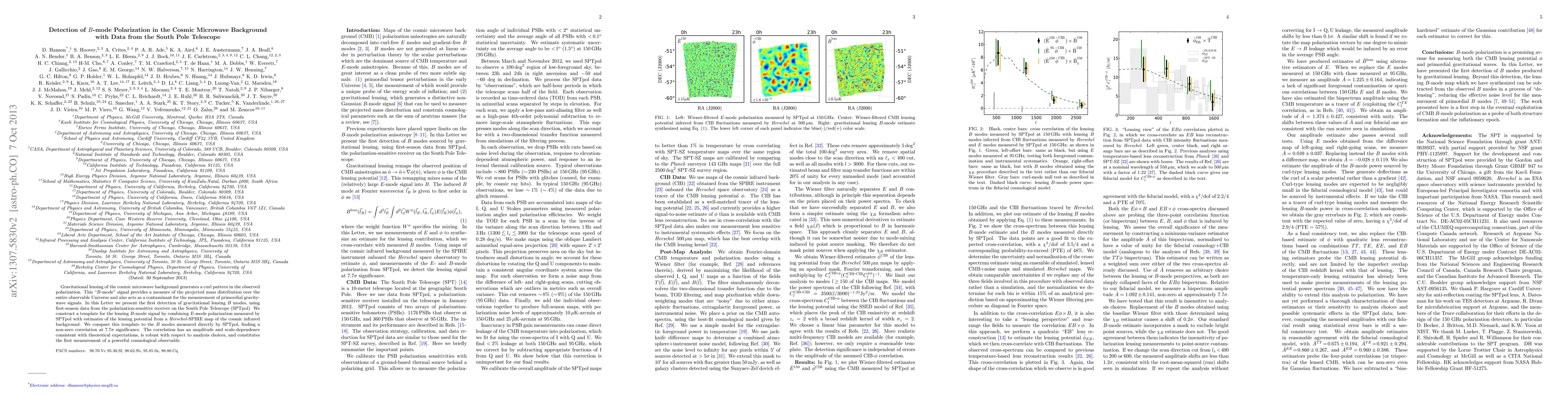 This paper reports the first detection of gravitational lensing B-modes in the cosmic microwave background using data from the South Pole Telescope's SPTpol. The findings confirm the presence of a non-zero correlation at 7.7 sigma significance, consistent with theoretical predictions and marking a significant step in cosmological observations.