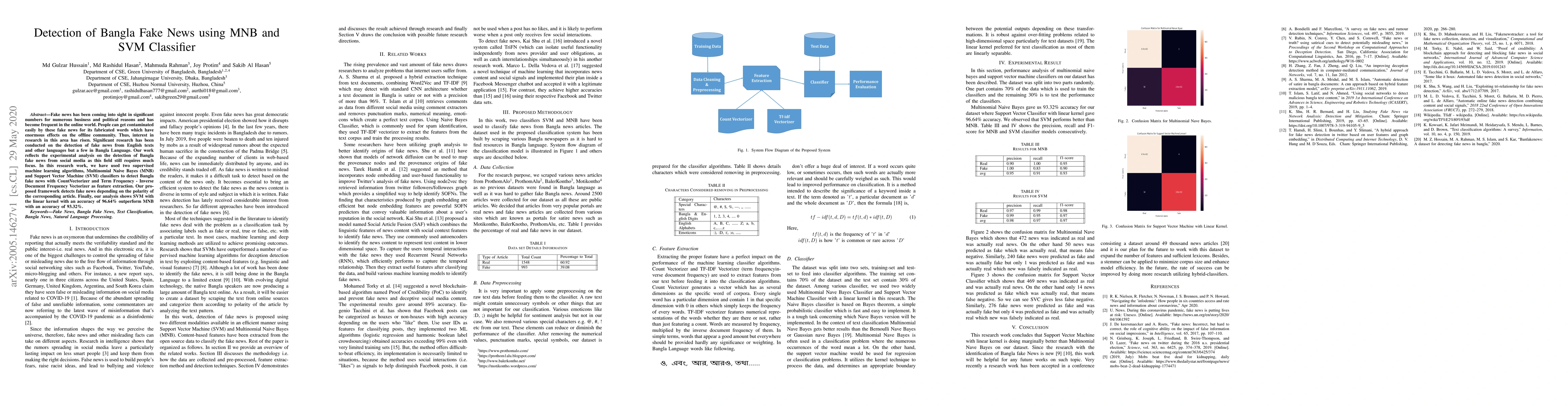This paper investigates the detection of Bangla fake news using supervised machine learning algorithms, specifically MNB and SVM classifiers, with feature extraction via CountVectorizer and TF-IDF. The study finds that SVM with a linear kernel achieves higher accuracy (96.64%) compared to MNB (93.32%) in identifying fake news from social media.