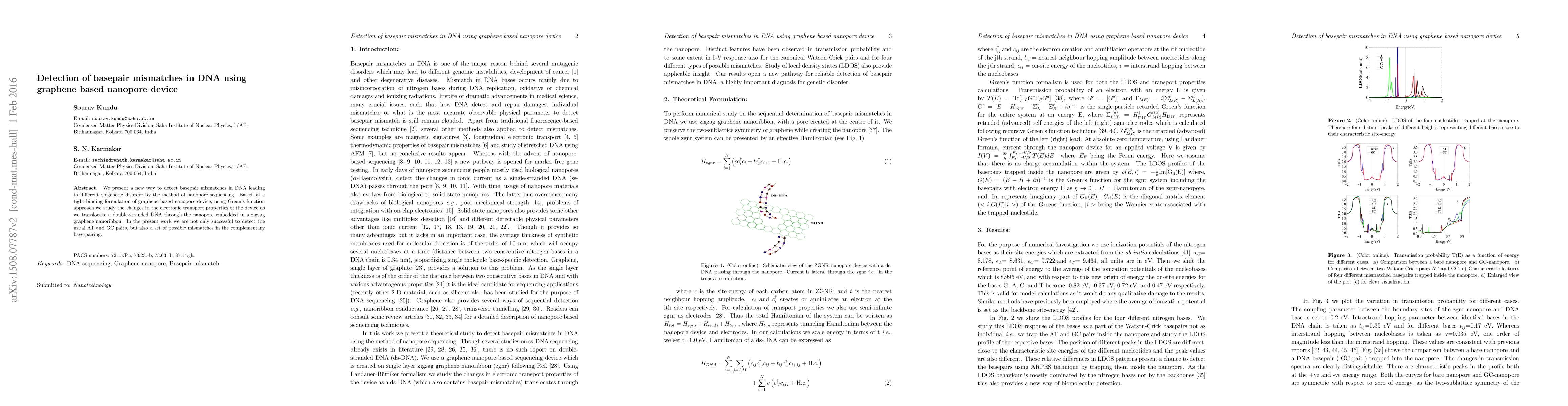 This paper introduces a graphene-based nanopore device for detecting basepair mismatches in DNA through changes in electronic transport properties, successfully identifying both standard and mismatched base pairs, and demonstrating potential for detecting other biomolecules.
