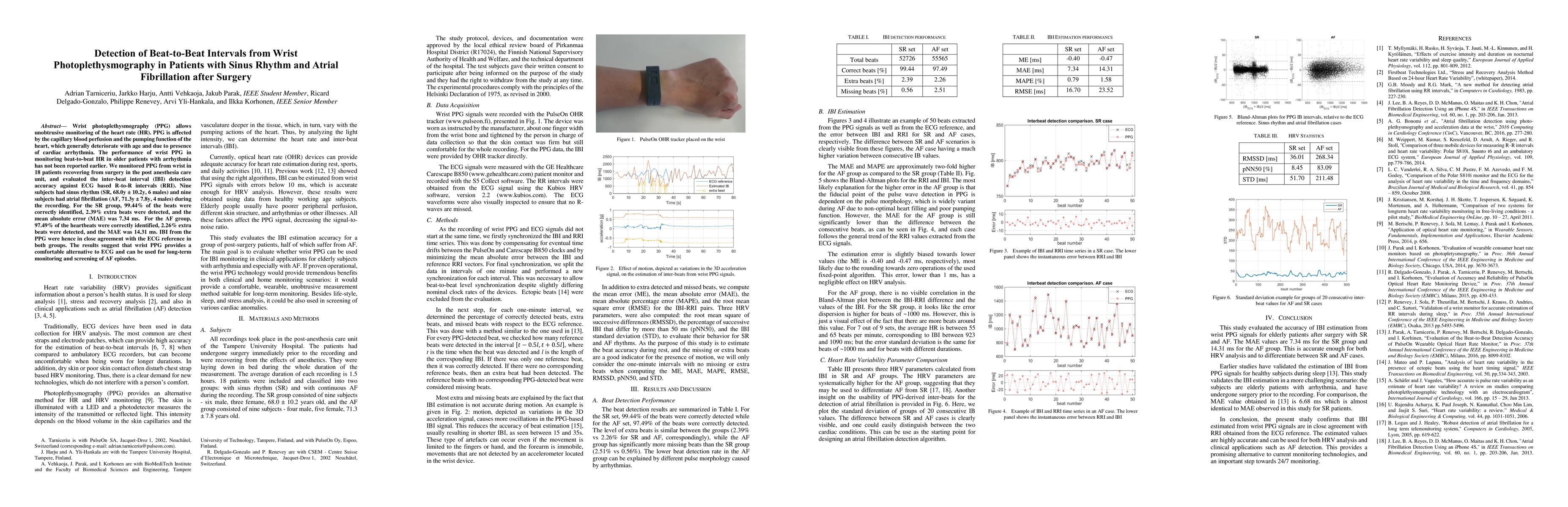 This study evaluates wrist photoplethysmography (PPG) for detecting beat-to-beat intervals in older patients recovering from surgery, comparing its accuracy to ECG. Results show high accuracy in both sinus rhythm and atrial fibrillation groups, suggesting PPG as a viable alternative for long-term monitoring.